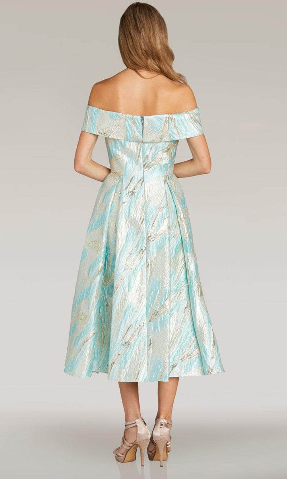 Step into any evening event with this creation from Feriani Couture 18341. This jacquard dress exudes femininity and elegance. It highlights the fold-over detailing on the straight-across off-shoulder neckline and short sleeves. The mid-open back is secure by a center zipper closure for a seamless and comfortable fit. The pleated skirt gracefully flares out, creating a tea length A-line silhouette that suits any body type. Orchestrate your moment to be prominent in this Feriani Couture 18341 masterpiece. Model is wearing Turquoise color.