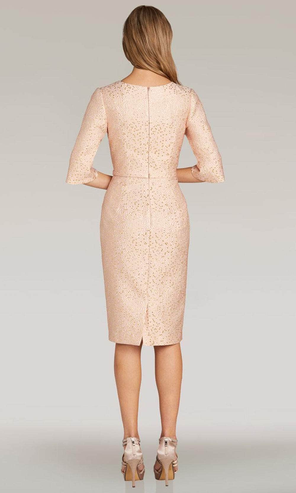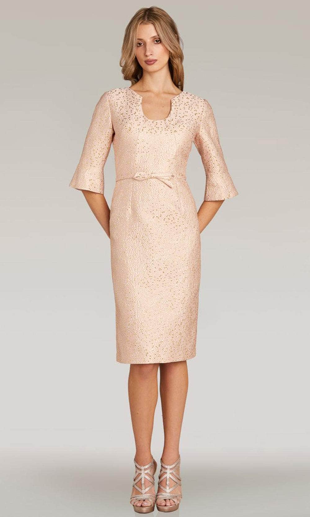 Render them speechless in this Feriani Couture 18347 creation. Embracing your feminine allure, the dress is opulently festooned with sparkly beads. It displays a modified scoop neckline and quarter-length bell sleeves. Also, the full back design has a center zipper closure for a perfect and comfy fit. A bow thin belt accentuates your waist, while the skirt creates a knee-length sheath silhouette that culminates with a vent slit. This Feriani Couture 18347 masterpiece is a must-have for formal or any event. Model is wearing Blush color.