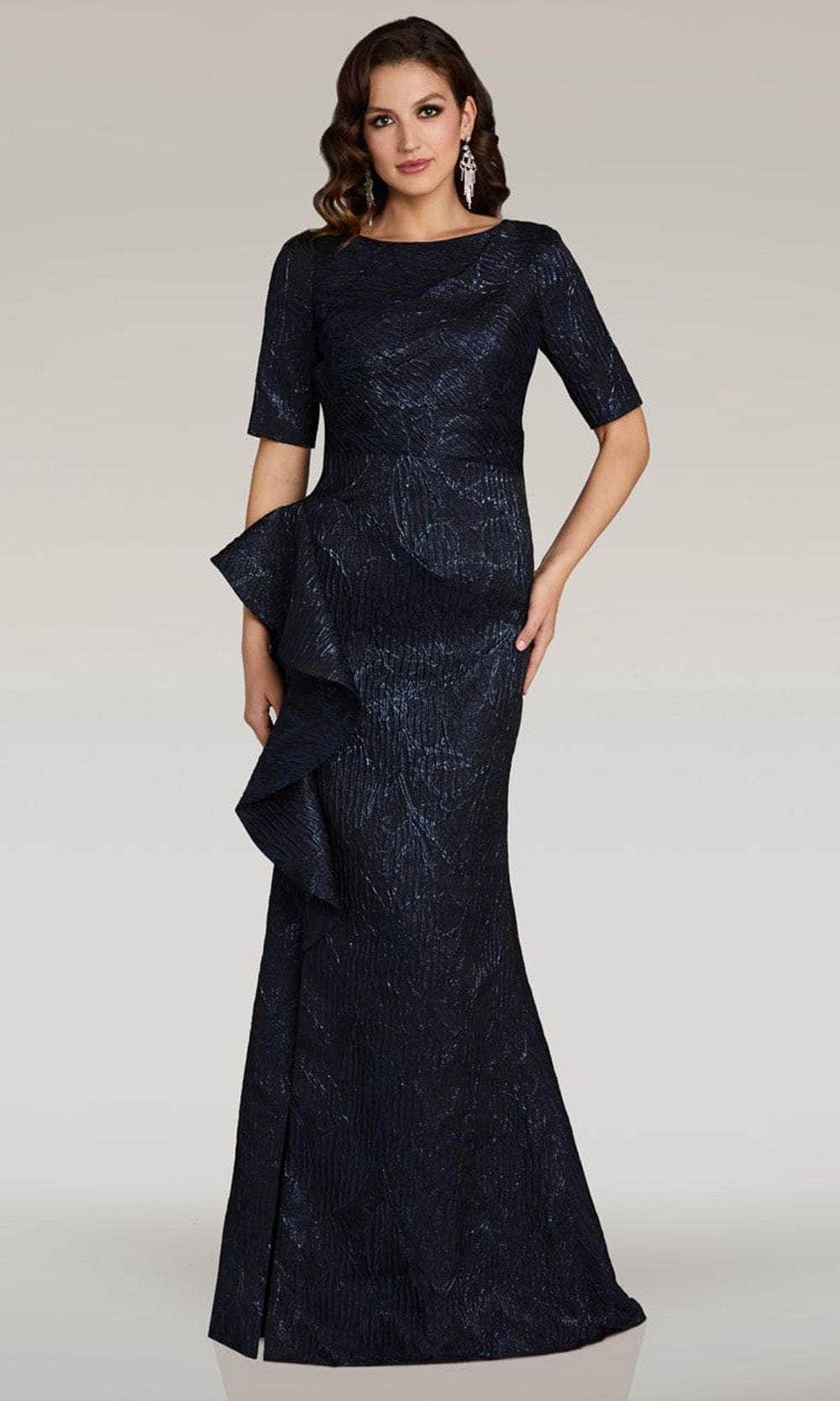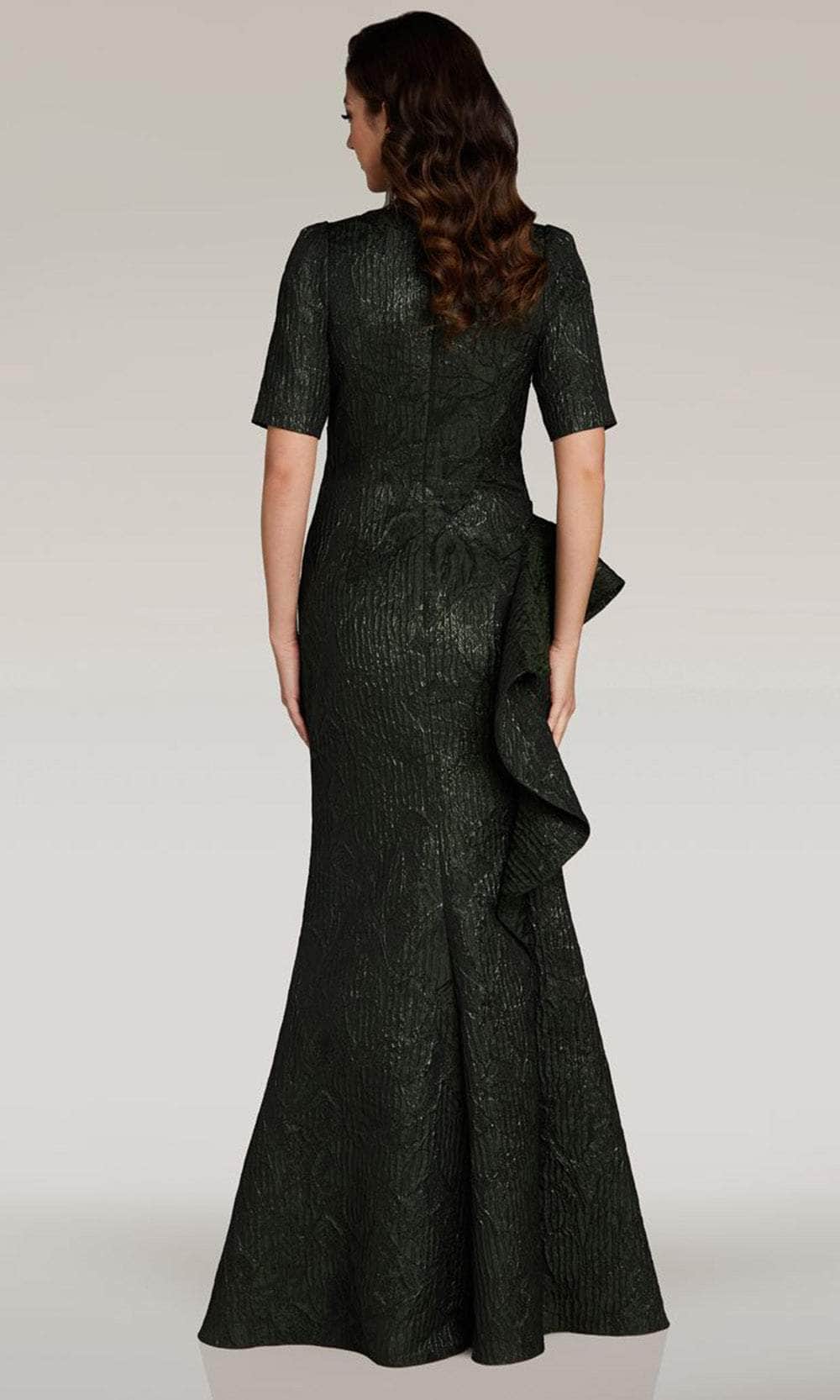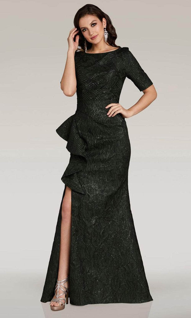 Unleash your inner queen in this Feriani Couture 18355 masterpiece. This ensemble is luxuriously crafted from a jacquard that exudes elegance and magnetism. Shown are the bateau neckline, short sleeves, and a full back design with zipped-up closure. The side ruffle draped atop the high slit adds a touch of playfulness and drama. To finish it off, the skirt gracefully sweeps the floor and forms a mermaid silhouette. This Feriani Couture 18355 gown is remarkable for formal or for any special night event! Models are wearing Olive, and Navy colors.