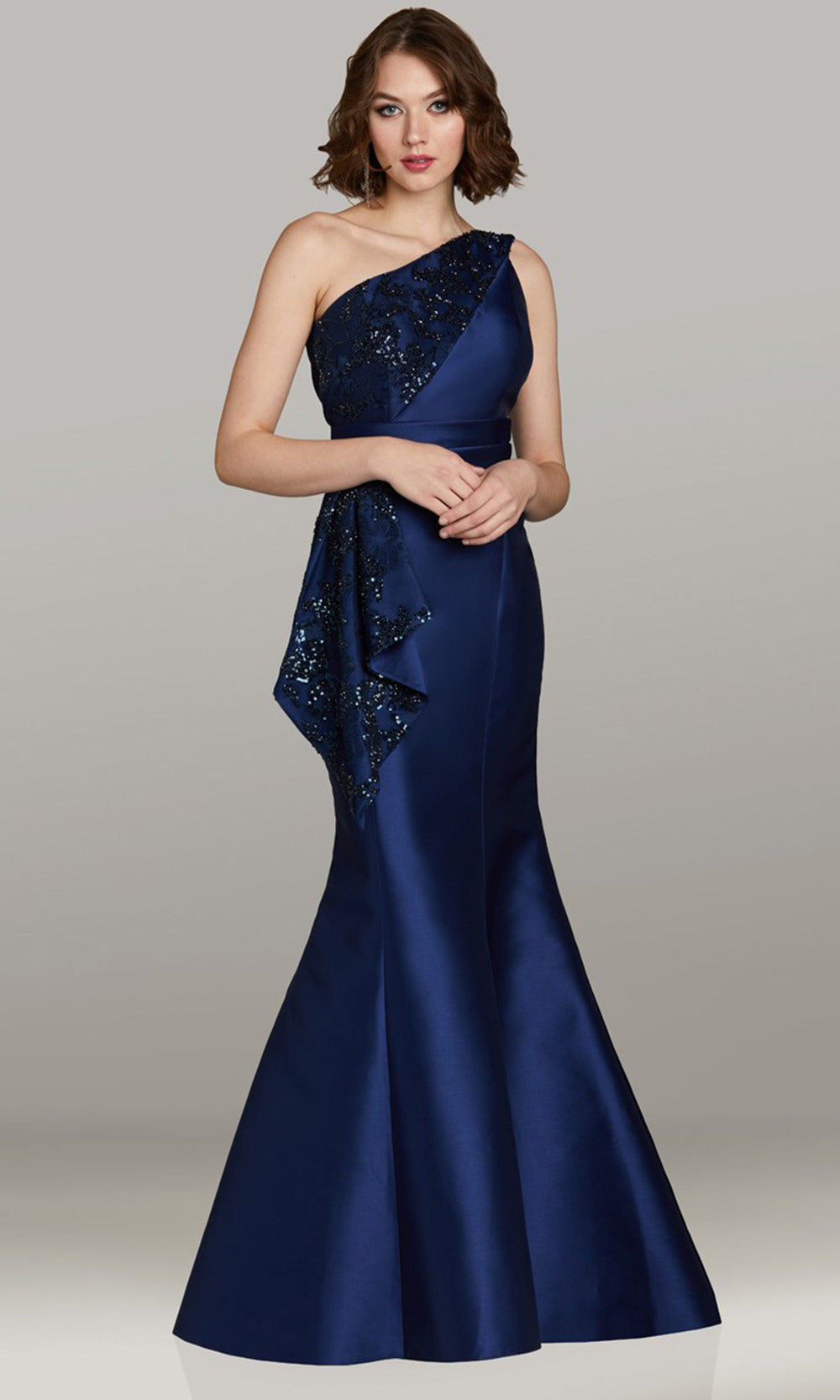 Elegance takes a powerful form in Feriani Couture 18478, merging timeless grace with architectural precision. The sleeveless cut and asymmetric neckline brings a striking sense of direction, accentuated by detailed embellishment that enhances its sculptural shape. A structured pleated waistband highlights the silhouette before flowing into a graceful mermaid flare. Every element of Feriani Couture 18478 long dress reflects an empowered aesthetic, created for moments where confidence and sophistication move as one. Model is wearing Navy color.