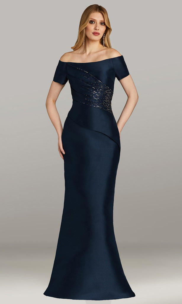 Radiant sophistication comes alive in Feriani Couture 18480, where impeccable tailoring and luminous detailing create a commanding statement of grace. The off-shoulder straight neckline elegantly frames the collarbone, while diagonal beaded embellishments draw the eye along the bodice. The long sheath silhouette sculpts the figure, enhancing natural curves with smooth continuity. Feriani Couture 18480 mirrors the confidence of a modern woman whose presence effortlessly captivates, making it a perfect choice for grand soirees or elegant evening receptions. Model is wearing Navy color.