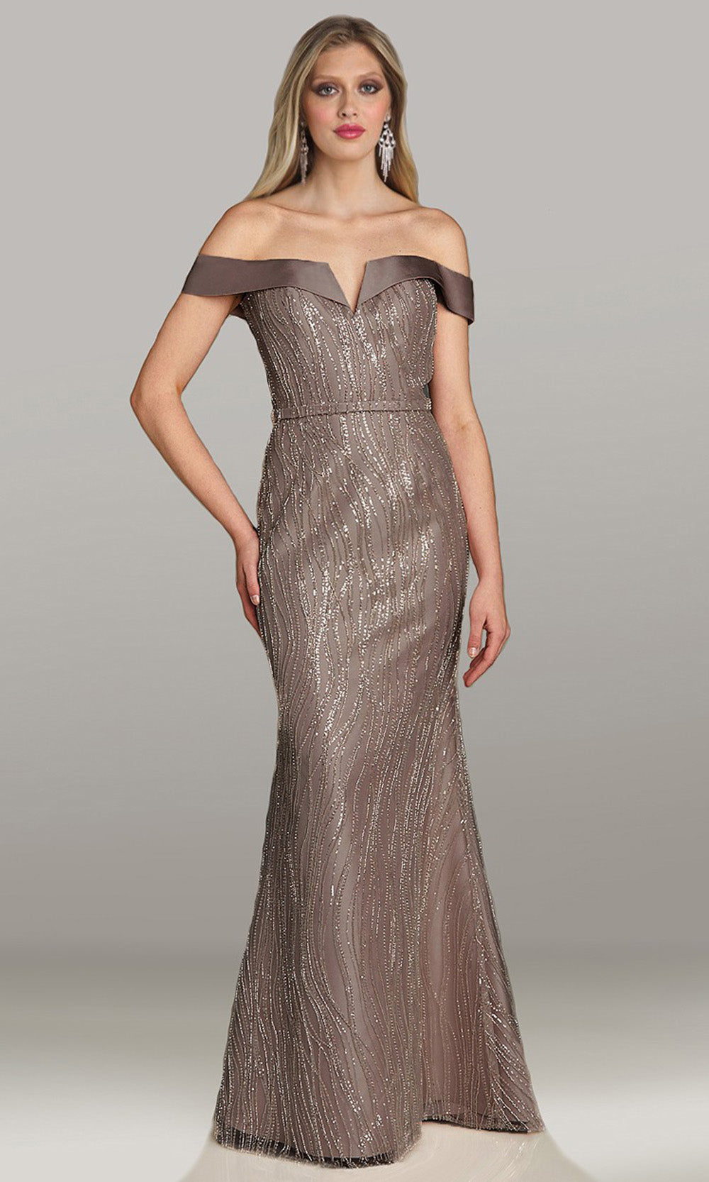 Glamour finds new rhythm in Feriani Couture 18491, a vision of refined symmetry and luminous texture. The off shoulder sleeves and notched v-neckline frames the collarbone with poised allure, balanced by a sleek fold-over edge. Shimmering linear beadwork contours the figure, drawing the eye toward a cinched waist and graceful flare. Every element of Feriani Couture 18491 sheath dress radiates confidence, perfect for moments that demand elegance without restraint. Models are wearing Blush, and Charcoal colors.