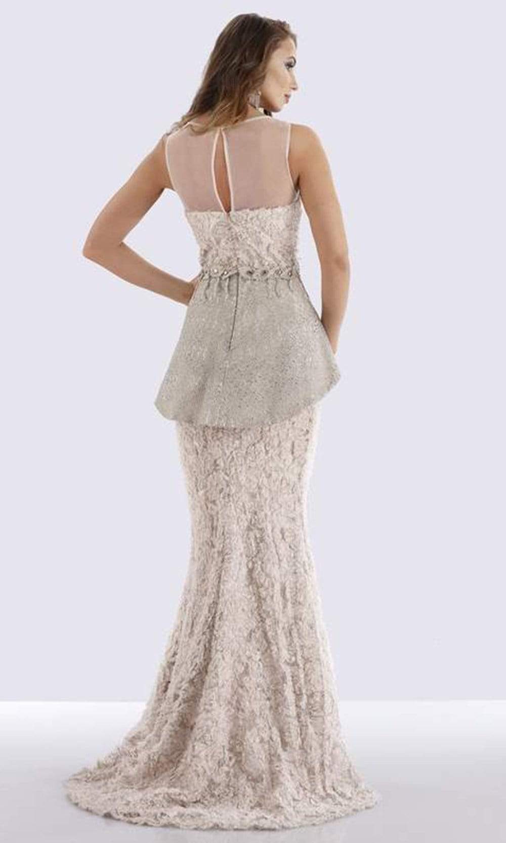 Walk in glamour and let all heads turn on you in this creation by Feriani Couture 18655. Beautifully textured with stunning dimensional fabric, this darling presents a sleeveless bodice accented with an illusion bateau neckline and a sheer keyhole cutout back. Hugged with an asymmetrical embellished peplum, the sheath skirt runs from a fitted to a slightly flared full-length hemline and a sweeping train. Make a dramatic entrance with an elegant Feriani Couture masterpiece.