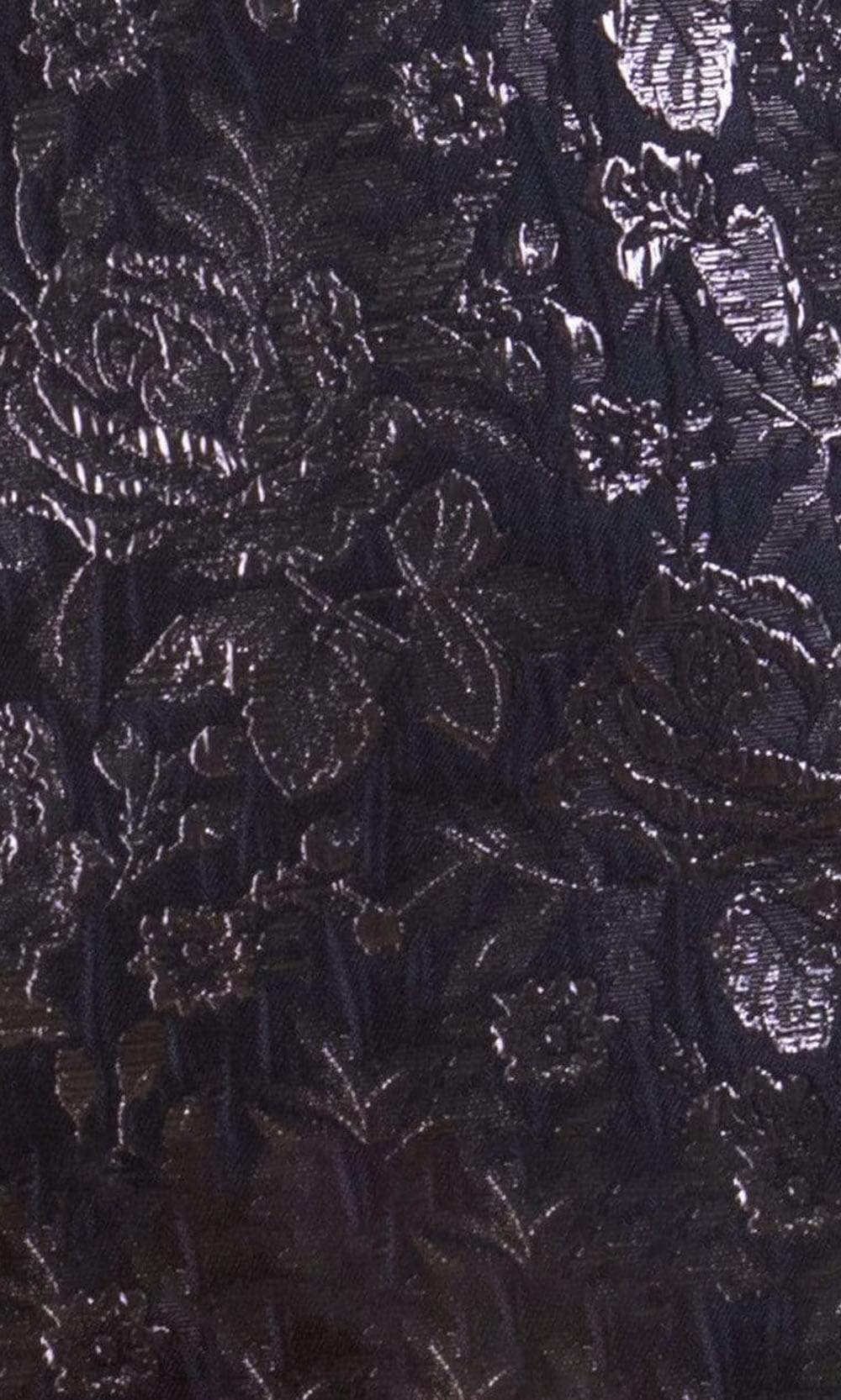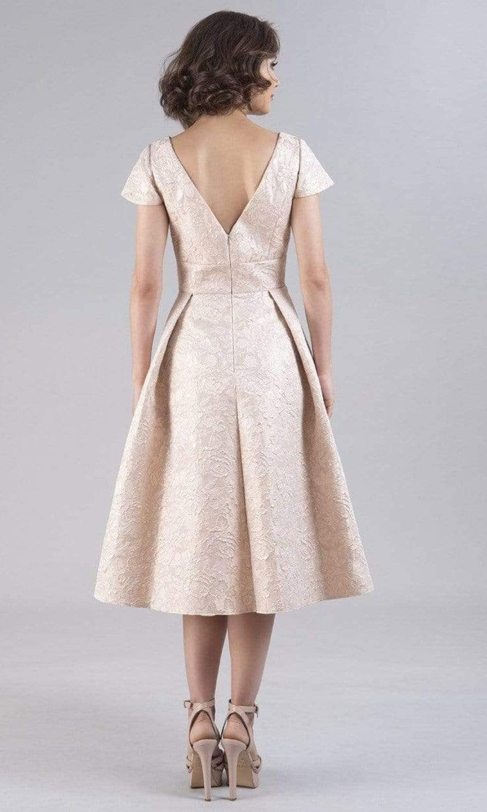 | Details: | Brocade-like, Short Sleeves, V-Open Back, Zipper Closure, Beaded Waist, Tea Length Hem |