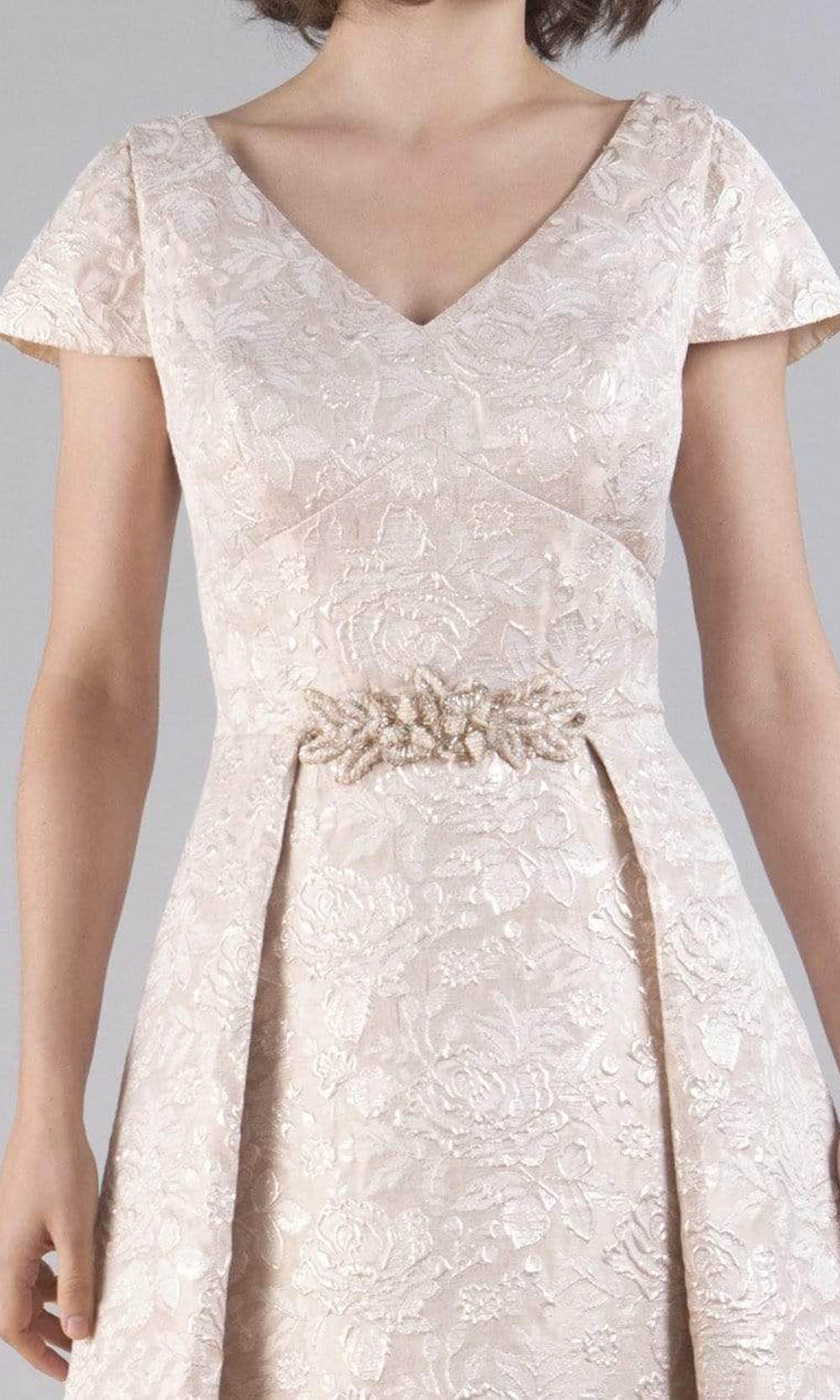 Flourish pure elegance in this stunning Feriani Couture 20515 creation. Crafted in a brocade like silhouette, this stunner crafts short sleeves framing its v-neckline and v-open back. Embellished with beadwork at the waist, the skirt flares into a tea length hemline. Glow with optimum beauty in this Feriani Couture masterpiece. Models are wearing Champagne color.