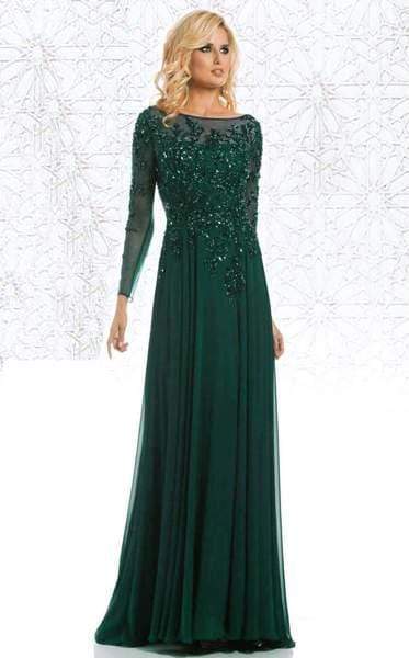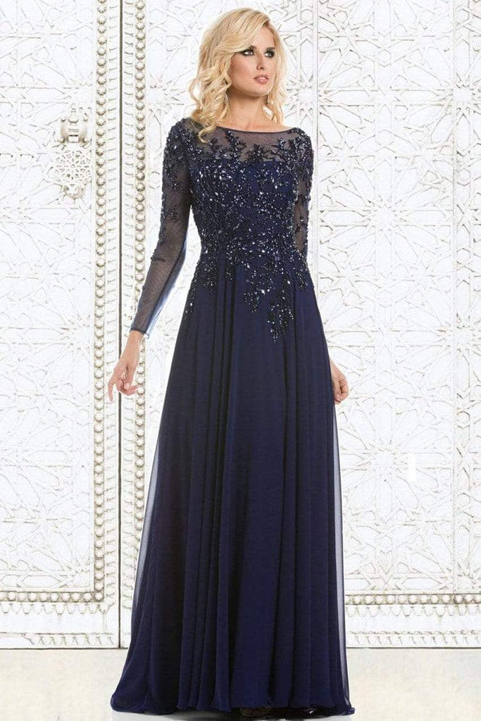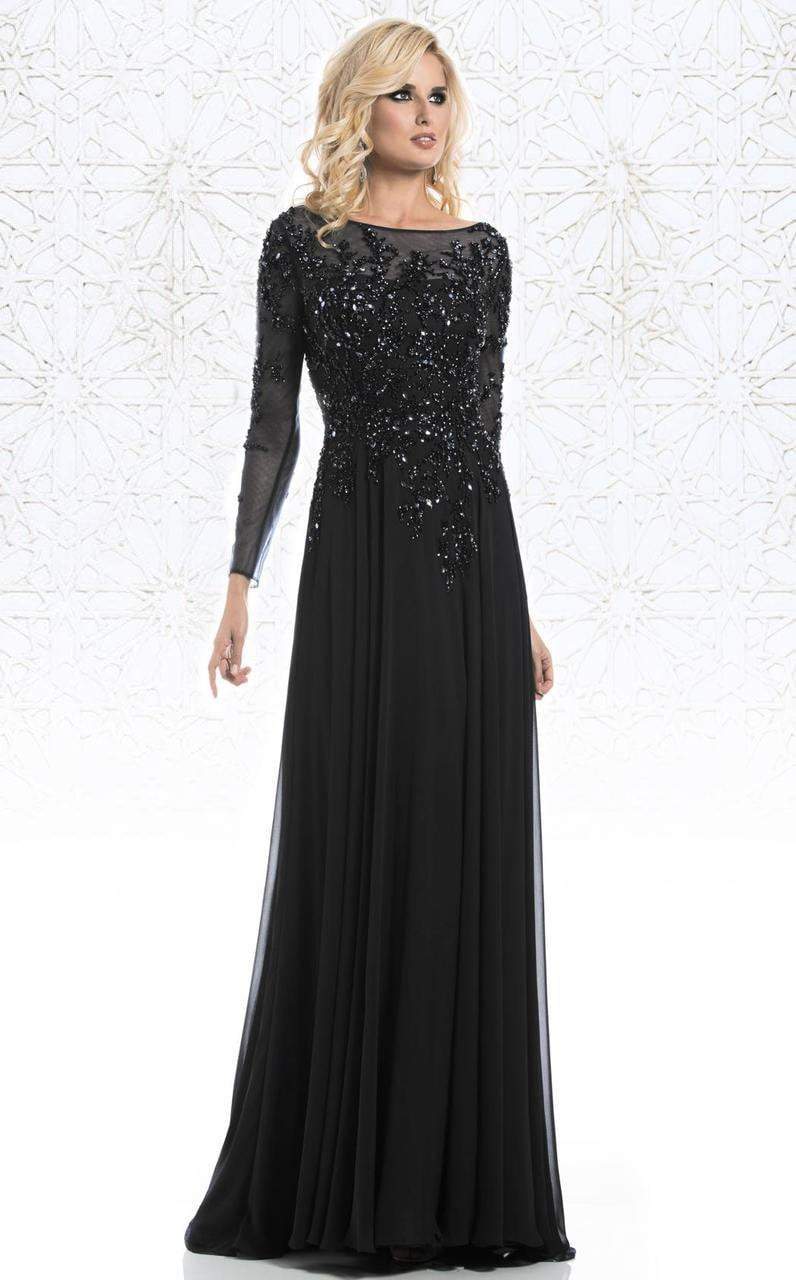 Bring on that commanding beauty in this crystal-embellished evening gown by Feriani Couture 26145. This classy dress features a sheer yoke and long slender sleeves with crystal embellishment brilliantly sparkle and sewn throughout the bodice. The back features a keyhole with similar embellishment. Gossamer gathers shape the flared skirt as it flutters to full-length. This beautiful ensemble by Feriani Couture is perfect for formal gathering or wedding, especially fitting for the mother of the bride. Dress is pictured in Navy, Charcoal, Black, and Emerald variants.