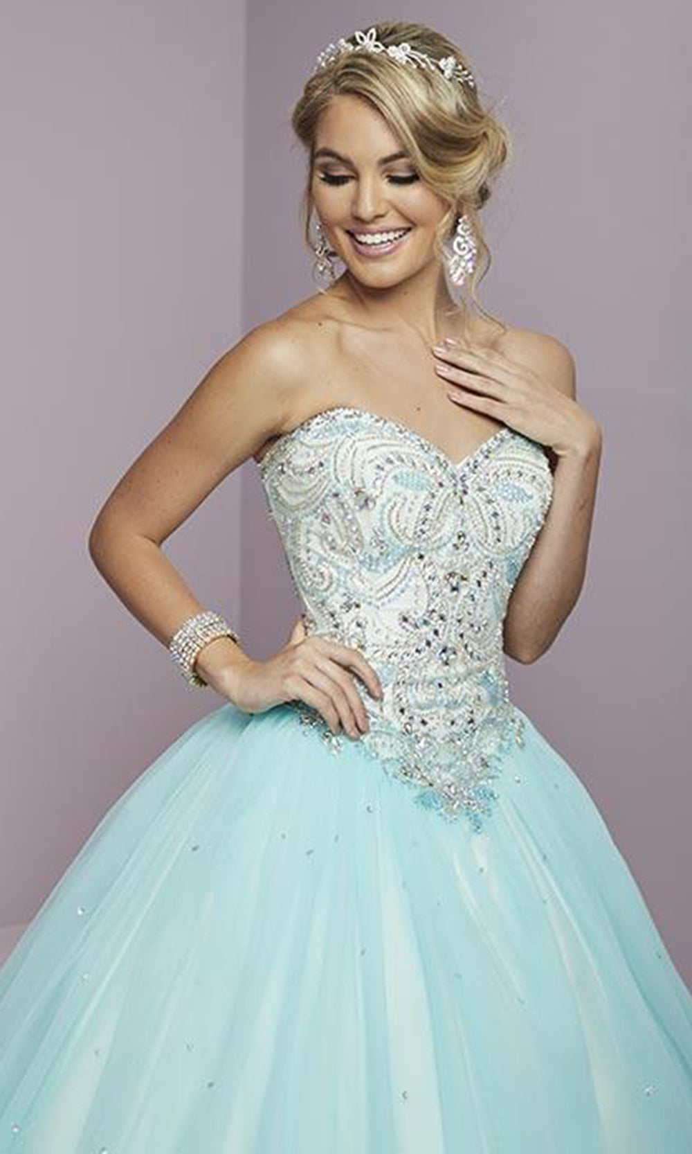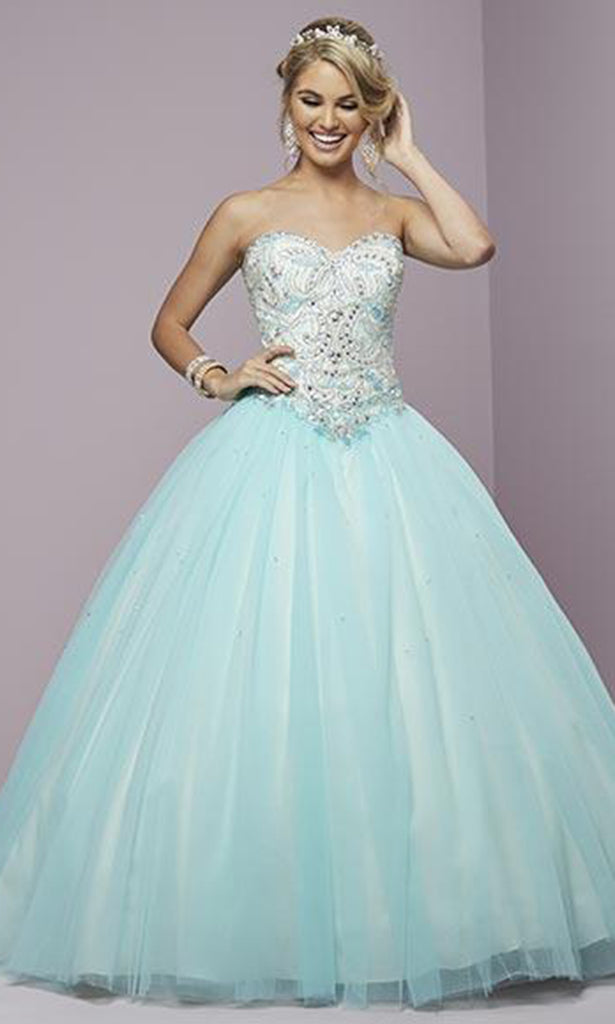 Sophisticated and modish, this refined evening gown by Fiesta Gowns 56287 is a versatile choice for your next gathering. This strapless gown features a sweetheart neckline with fitted bodice ornate with sparkling sequins and small AB stones. The back has a lace up closure and flourishes a full length tulle ballgown skirt. This Fiesta Gowns masterpiece is perfect for a standout style and flawless fit.
