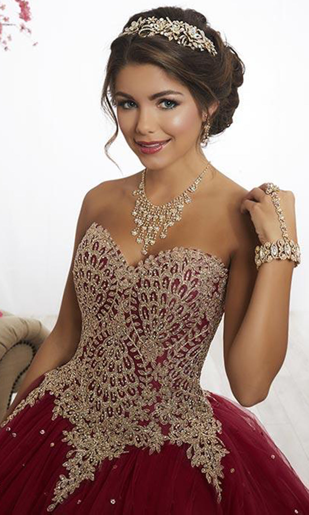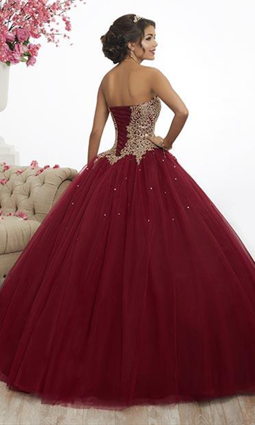 Leave everyone speechless as you enter the room in this mesmerizing gown from Fiesta Gowns 56341. Features a strapless, sweetheart neckline with fitted bodice designed with embroidered lace and AB rhinestones. The back has a lace up closure while the pleated skirt opens in a ballgown silhouette with speckles of tiny sequins. You are princess for an evening in this beautiful design of Fiesta Gowns Model is wearing Wine color. Find more Quinceanera Dresses.