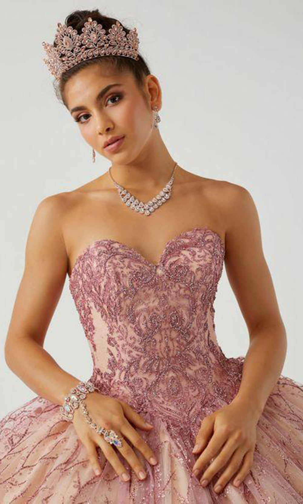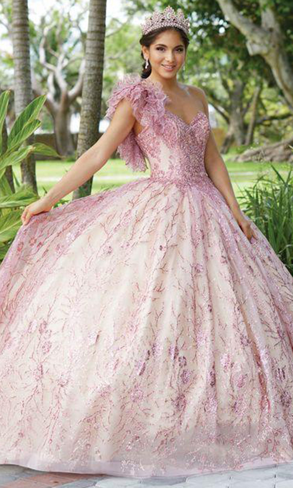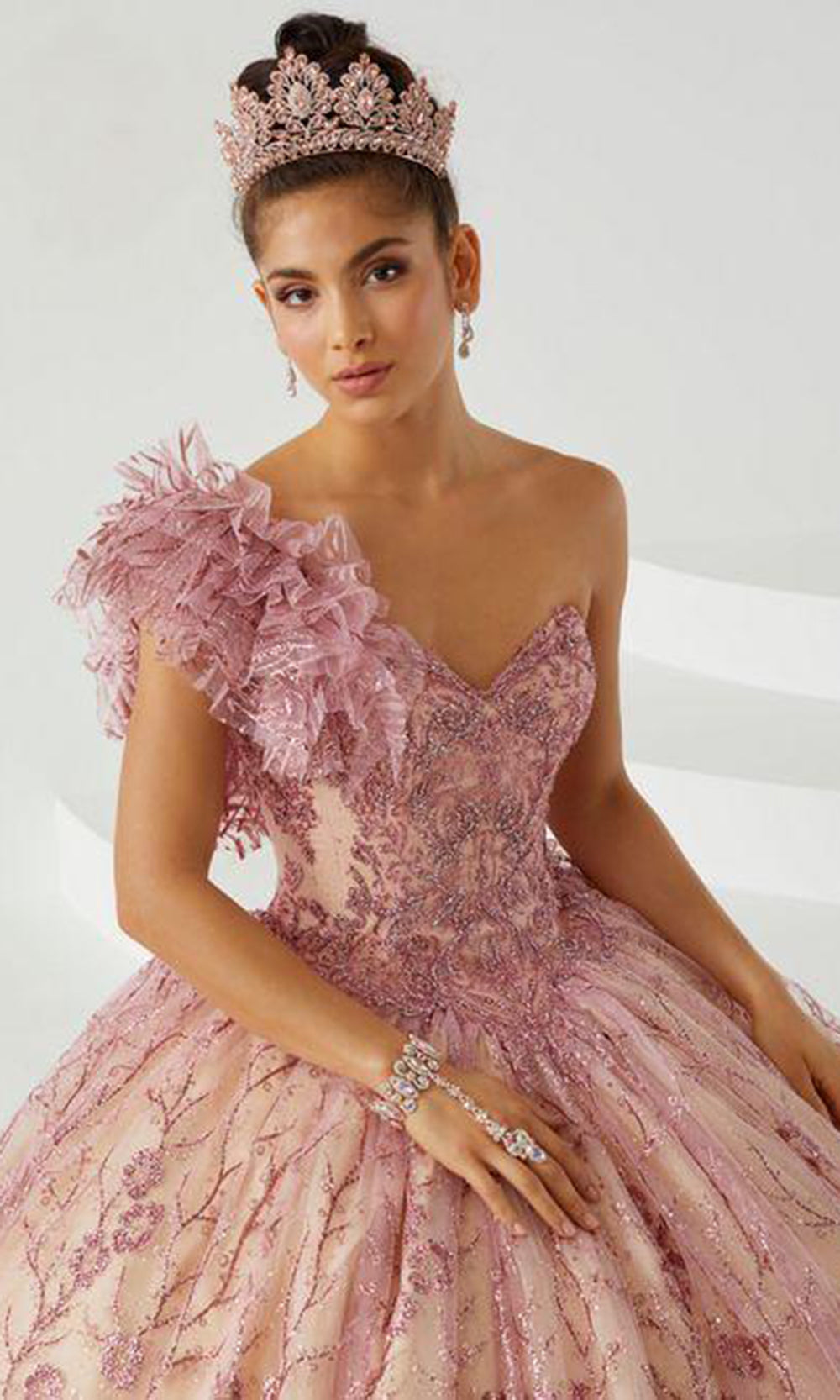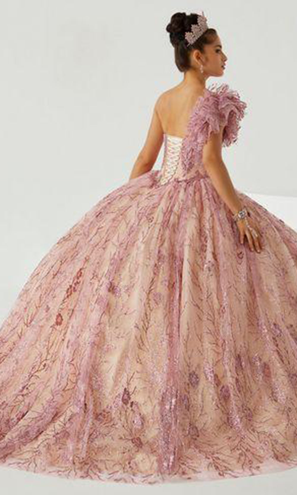 You will be the envy of the night in this amazing creation with striking details by Fiesta Gowns 56440. Designed with floral glitter appliques, this gown is crowned with a strapless and sweetheart neckline. It also highlights a detachable ruffled one-shoulder strap and the mid-rise back has a lace-up closure for an adjustable fit. The skirt opens in a voluminous ballgown silhouette and finishes in a sweep train. This evening gown by Fiesta Gowns is a red carpet knockout!