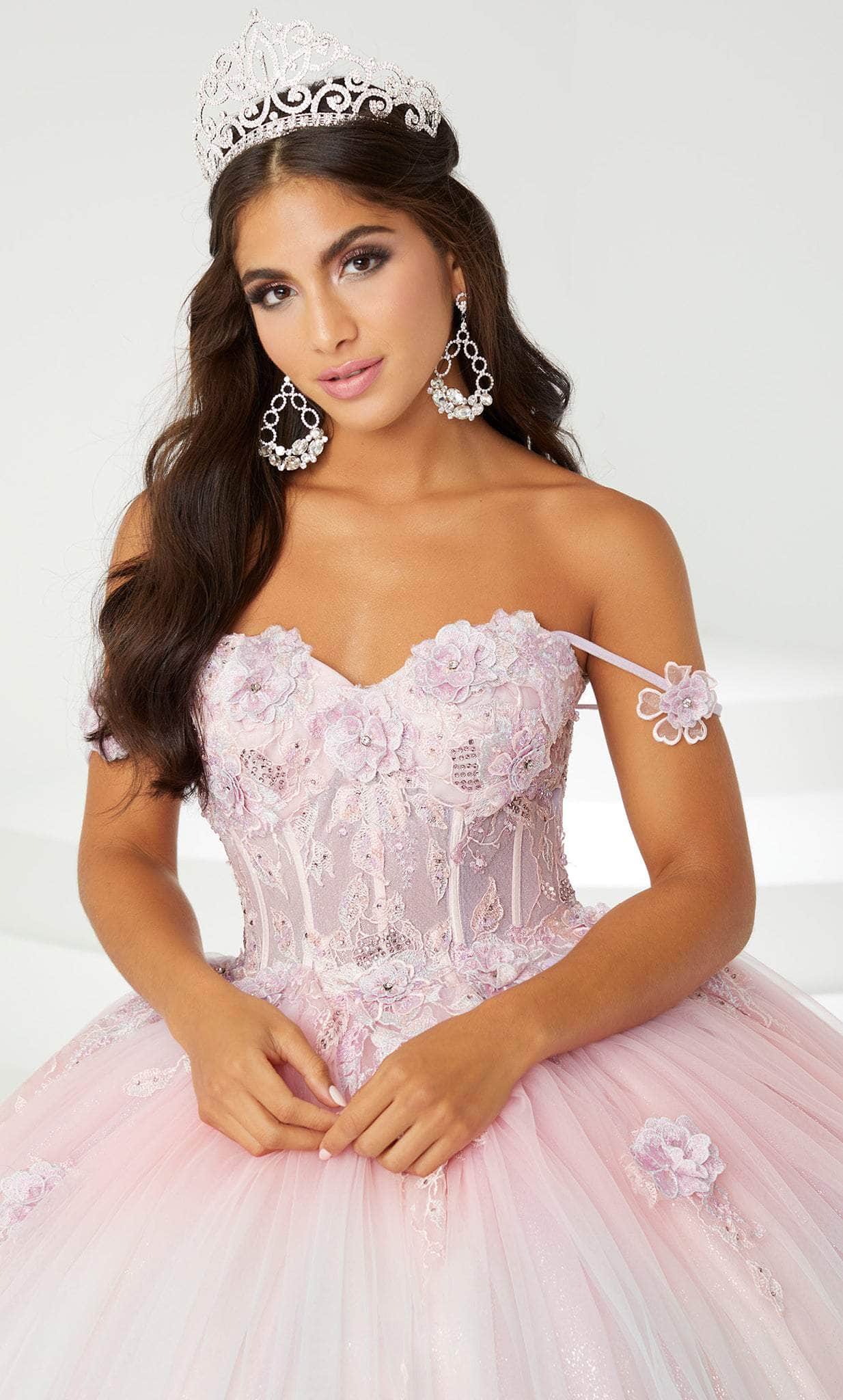 Surround yourself with decadence in a splendid gown in House of Wu 56469. This lavish piece impresses in a phenomenal ballgown silhouette. The tulle skirt features ombre colors for a subtle glamour, while lace floral embellishments add interest to the piece. The corset bodice ends at the natural waist, designed with stunning sheer lace and a sweetheart neckline. Thin off-shoulder straps frame the torso, adorned with a single flower sewn onto the strap. Turn heads instantly when you wear this House of Wu 56469 creation. Model is wearing Multi Ombre color.