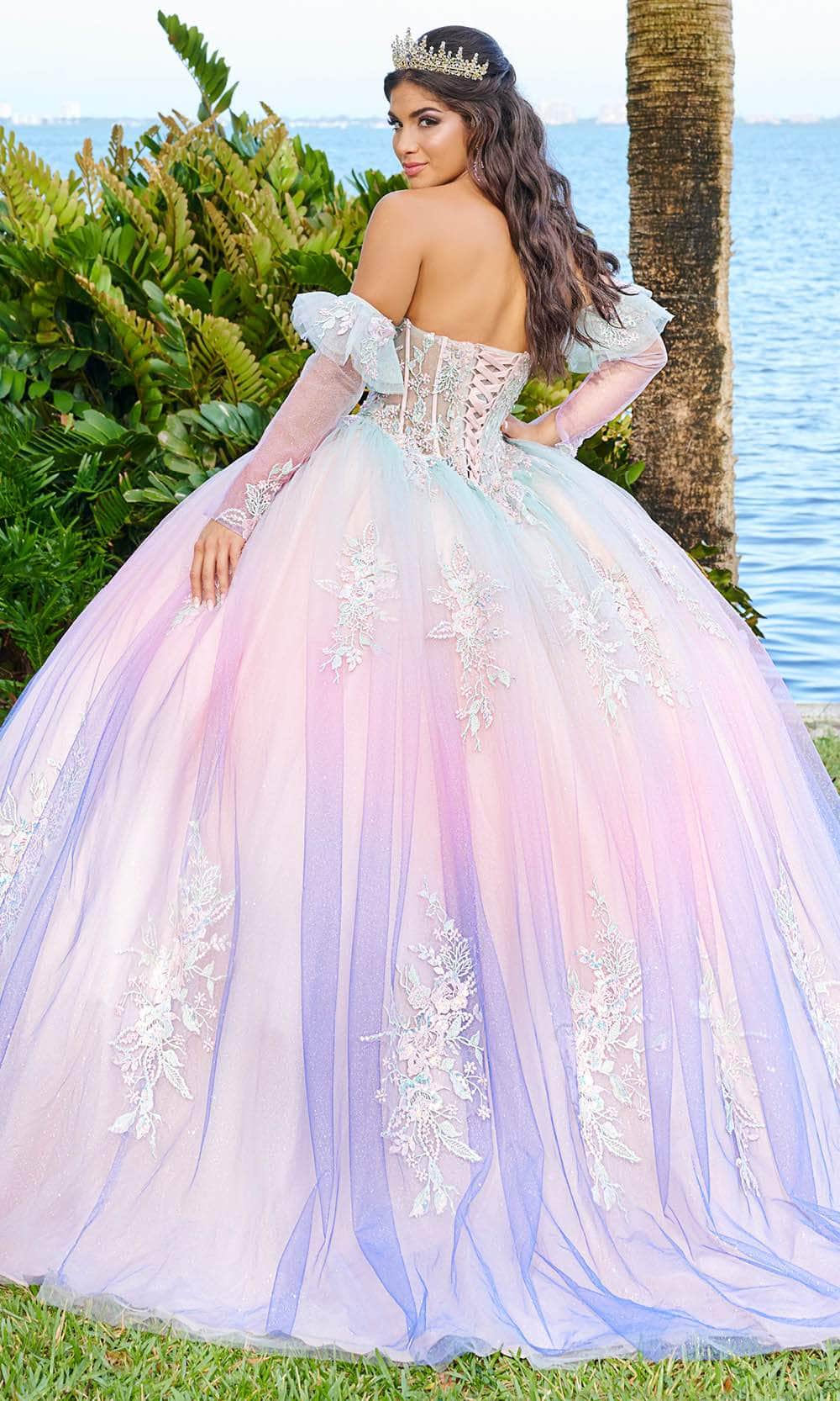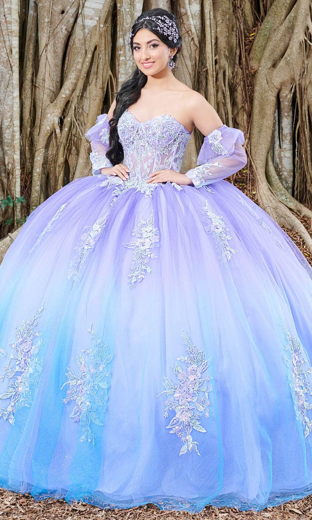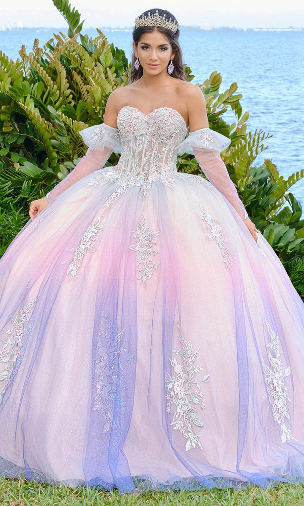 Embrace enchantment with Fiesta Gowns 56499, a mesmerizing ballgown that captures attention with its delicate details. The sweetheart neckline, accompanied by a lace detail bodice and a sheer corset bodice, creates an enchanting and timeless silhouette. The ombre multiple layers of tulle in the skirt, adorned with lace appliques, add a touch of whimsical charm, while the matching sleeves, lace-up back, and sweep train ensure an unforgettable entrance. Fiesta Gowns 56499 emanates grace and class. Models are wearing Blush Ombre, and Lilac Ombre colors.