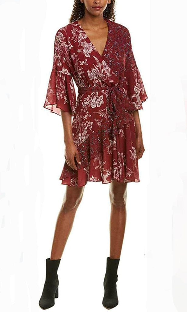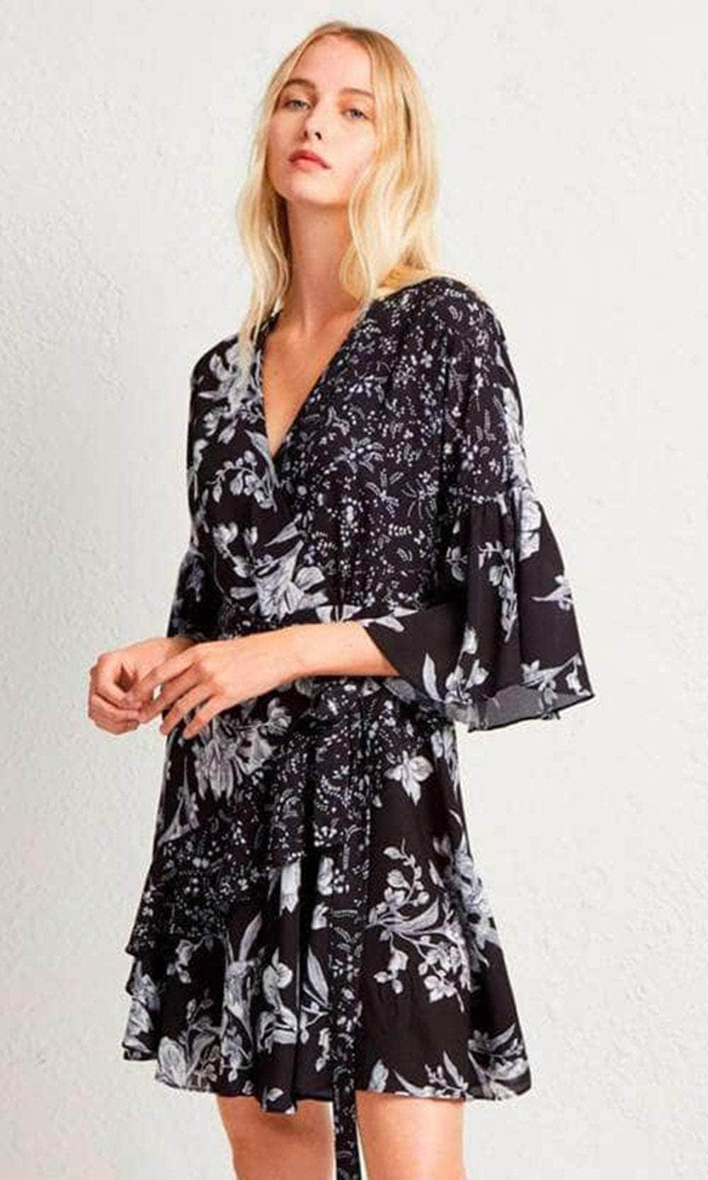 Impress everyone with the fabulous style of this French Connection 71KBI creation. Stunningly printed with gorgeous floral details, this stunner parades a surplice bodice that crafts a v-neckline. Framed with slender quarter sleeves ending in ruffled cuffs, this seam-tailored dress styles a tie strap accenting the side the natural waist. the A-line skirt fabulously flares to flutter with a mid-thigh hemline. Unveil that inner diva in you when you flourish this French Connection masterpiece. Couture Candy is committed to provide the very best when it comes to dresses for every occasion, and we are delighted to have French Connection on our side to aid us in delivering exquisite dresses for various occasions that are sure to make heads turn. Models are wearing the Framboise Multi and Black Multi colors.
