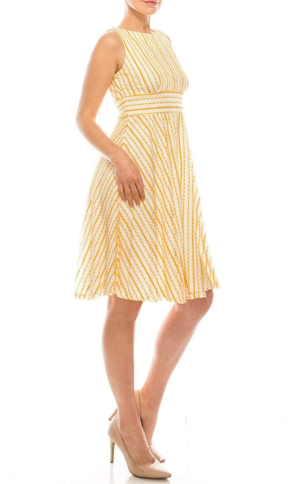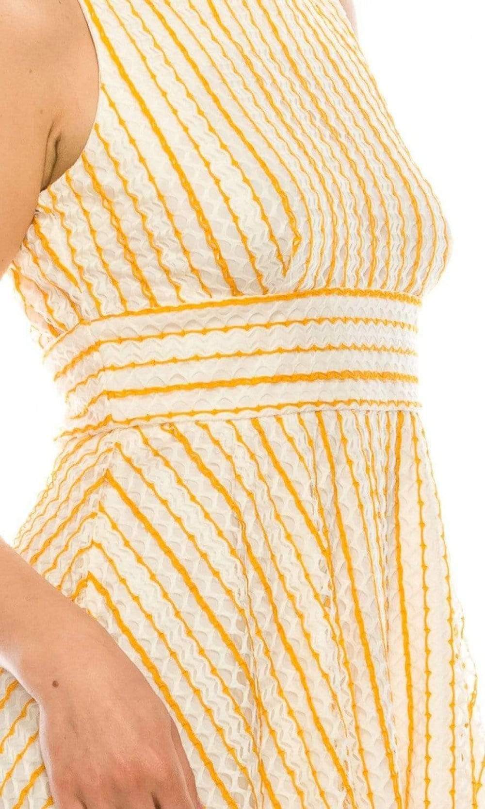 Look every bit like a dream in this exquisite Gabby Skye 18852M creation. Designed with crochet stripes rendering the sleeveless bodice, this dress has a jewel neckline with a full back. The waist is nipped with an empire style accent. The A-line skirt flows into a knee length hemline. Look like a dash of sunshine in this Gabby Skye masterpiece.