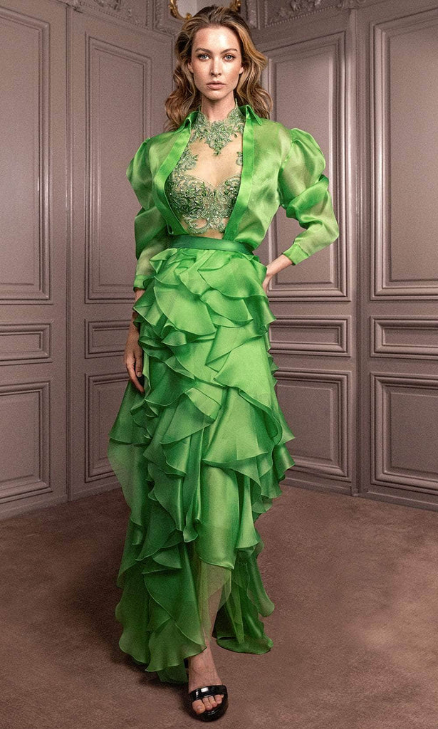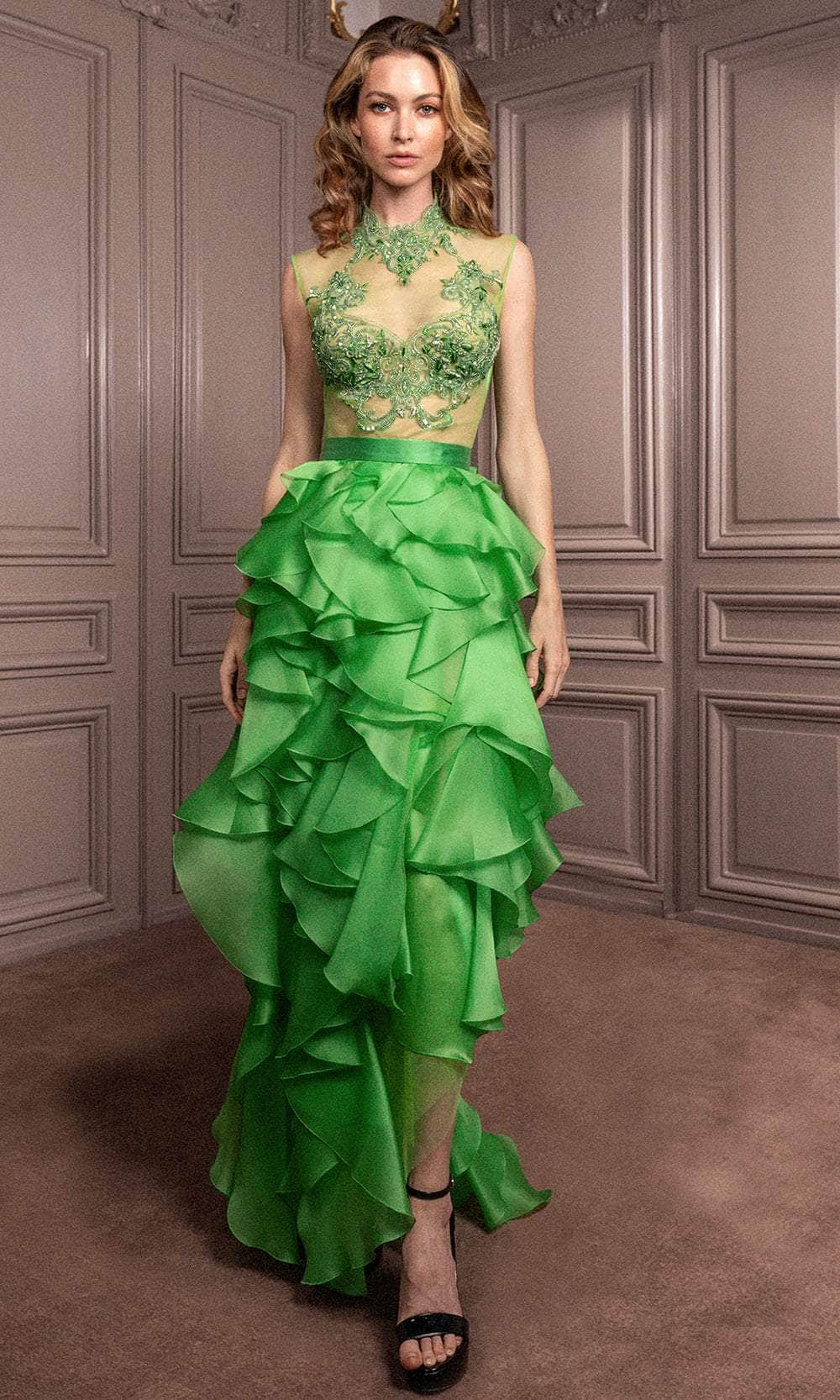 Have all eyes gravitate towards you while wearing this Gatti Nolli Couture GA-6796 + GA-6745 creation. Styled with an illusion high neckline festooned with lace appliques and embellishments, this stunner is designed with a sheer bodice and an illusion full back. Rendered with ruffles arranged in lush tiers, the silhouette forms and A-line design with a sweep train. A puff sleeve jacket with an open style matches this ensemble perfectly. Dance the night away in this tantalizing Gatti Nolli Couture GA-6796 + GA-6745 masterpiece. Model is wearing the Green color.