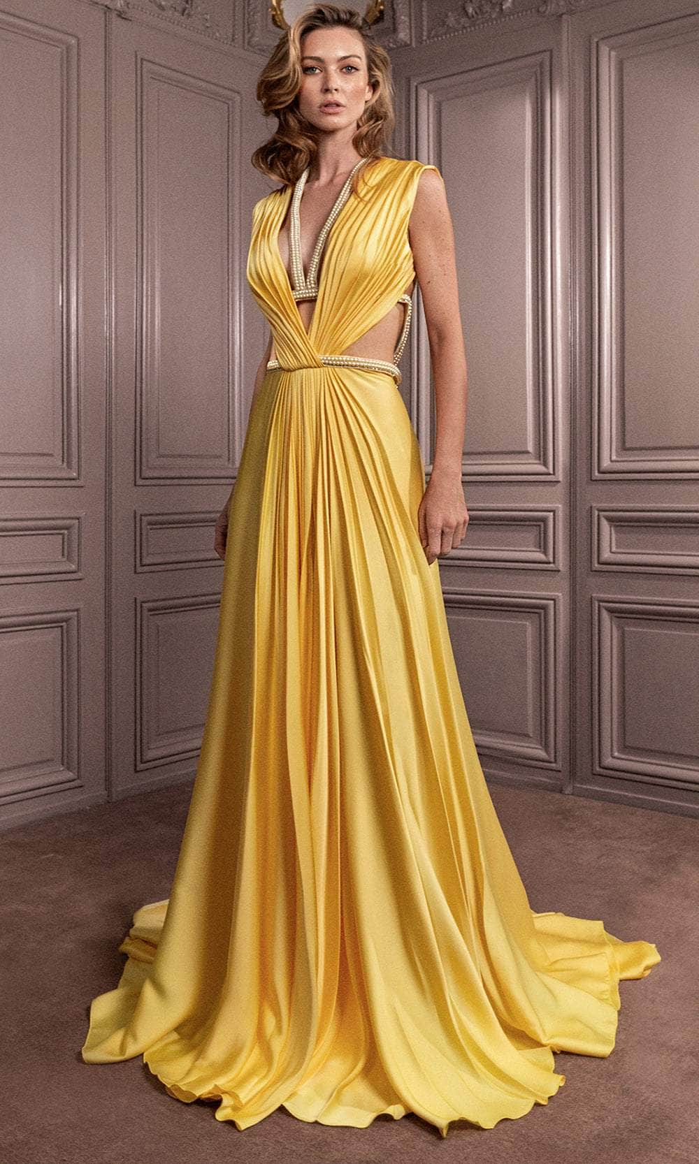 Feel glamourous in this fully embellished Gatti Nolli Couture GA-7045, a testament to exquisite craftsmanship and timeless allure. Tailoring lines grace the tantalizingly feminine form, accentuating its allure with cap sleeves and intricate pearl ornate strap details. The ruched bodice features a plunging V-neckline and side cutouts, while a weaved pearl waistband adds a touch of opulence. The open cutout back, adorned with beaded strap accents, imparts a captivating charm. Completing the ensemble is a pleated A-line skirt that gracefully cascades into a sweep train. Aspire to exude dominance among the upscale crowd in this Gatti Nolli Couture GA-7045 masterpiece. Model is wearing the Yellow color.
