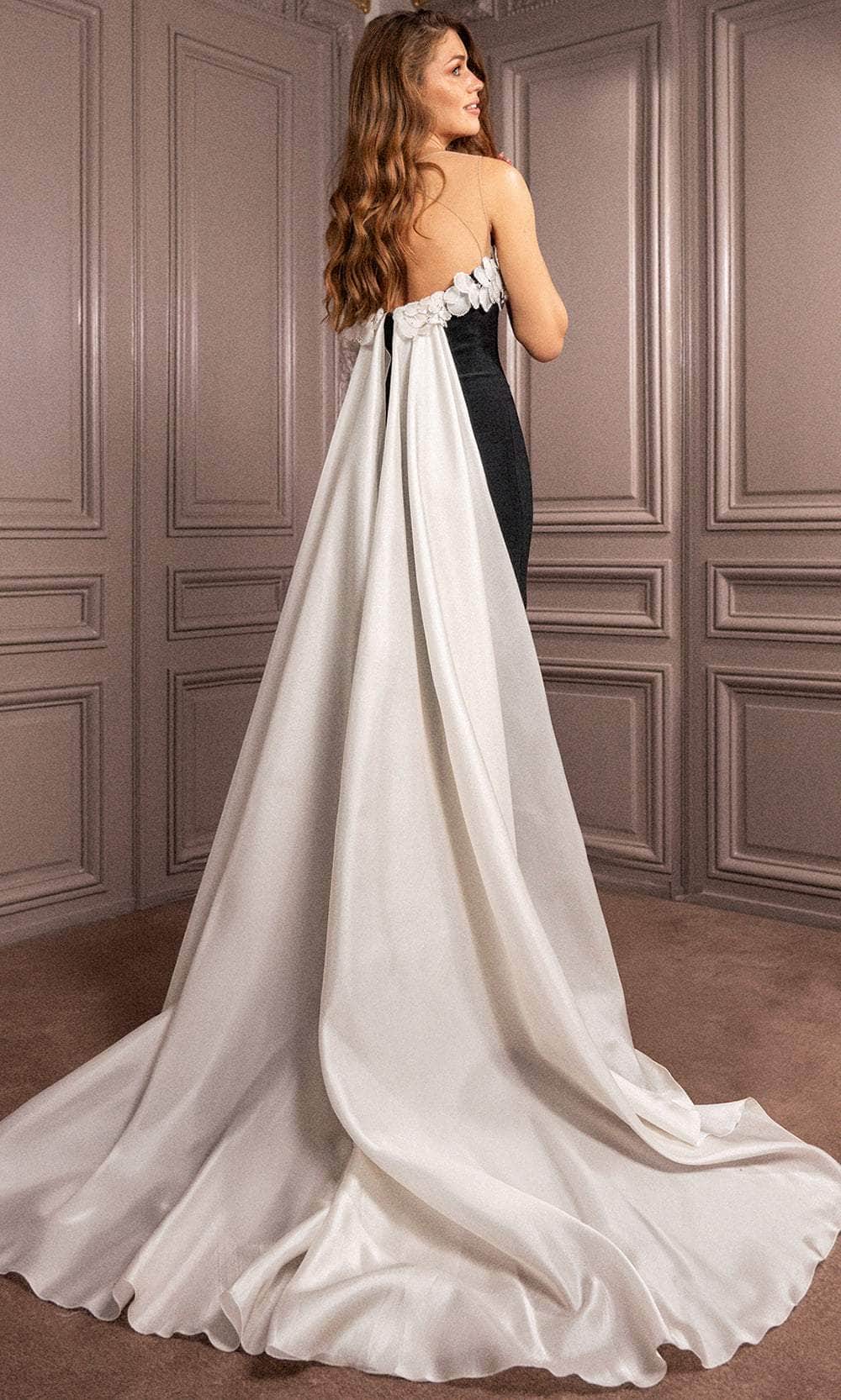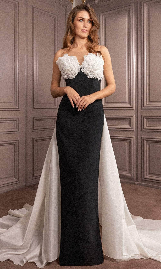 Resonate a sophisticated style at your fabulous soiree in this exquisite Gatti Nolli Couture GA-7071, a testament to sartorial artistry. The tailoring lines gracefully embrace a tantalizingly feminine form, complemented by a strapless, sweetheart neckline. A beaded petal accent delicately graces the bust, adding a touch of ethereal allure. The design is marked by a contrasting bodice, midrise back, and a concealed zipper closure adorned with cascading back panels. The sheath skirt effortlessly descends into a court train, epitomizing timeless elegance. With its meticulous craftsmanship and thoughtful details, the Gatti Nolli Couture GA-7071 will take you at the front and center of the limelight. Model is wearing the Black & White color.