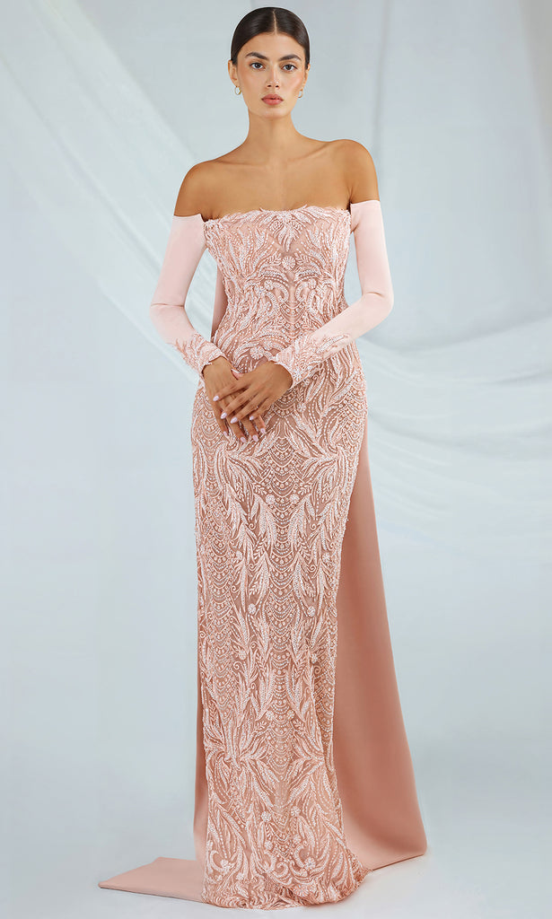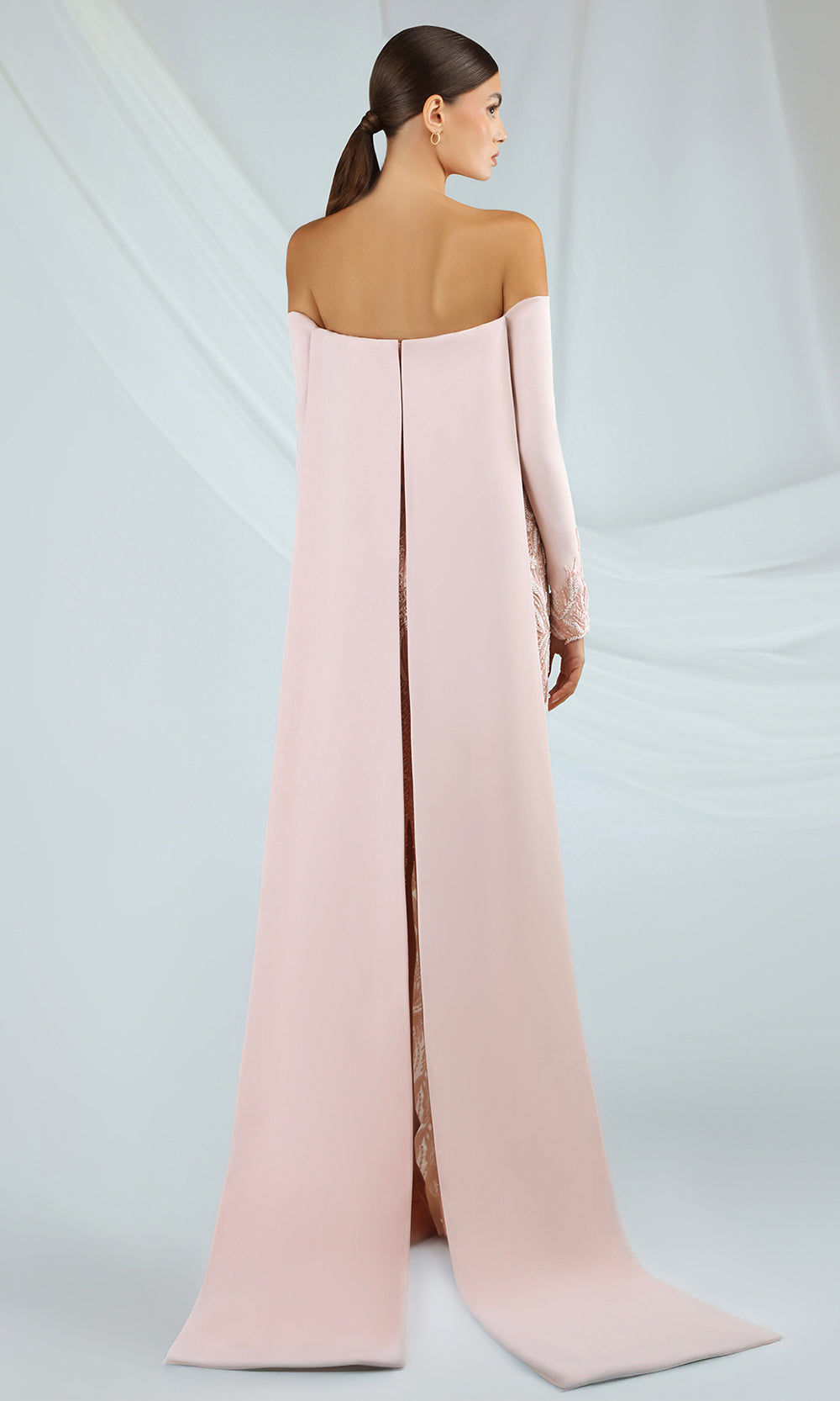 Gatti Nolli Couture OP-7367 offers dramatic styling in a sleek and feminine form. This off shoulder design pairs fitted long sleeves with elaborate embroidery that draws the eye throughout the length of the gown. The column silhouette hugs the body while a center back slit adds an alluring touch. A long crepe cape and sweeping train completes the look, providing additional interest. Gatti Nolli Couture OP-7367 makes an ideal choice for those who prefer a romantic yet fashion-forward formal gown. Model is wearing Light Powder color.