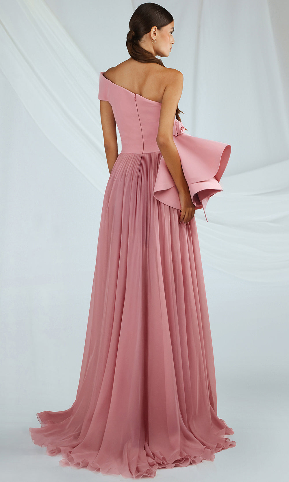 Experience the undeniable beauty and unforgettable presence that this Gatti Nolli Couture OP-7369 gown effortlessly delivers. The asymmetrical neckline leads to a voluminous peplum and 3D rosette appliques at the waist. Beneath, a pleated full-length A-line skirt cascades to the floor, punctuated by a daring thigh-high slit. The architectural design of the bodice stands in contrast to the airy quality of the chiffon skirt. Embrace a standout profile with Gatti Nolli Couture OP-7369 masterpiece. Model is wearing Pink color.