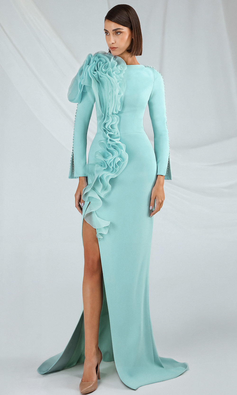 Unexpected details set Gatti Nolli Couture OP-7379 apart with a silhouette that leans into elegance with dramatic flair. The form-fitting sheath shape contrasts beautifully with a sculptural ruffle that runs from one shoulder to hem, establishing movement and shape. The high slit adds a bold feature, while the full-length sleeves are finished with decorative buttons. With a jewel neckline and sweeping train, this gown invites attention without excess. Gatti Nolli Couture OP-7379 delivers a strong visual impact through purposeful design. Model is wearing Aqua color.