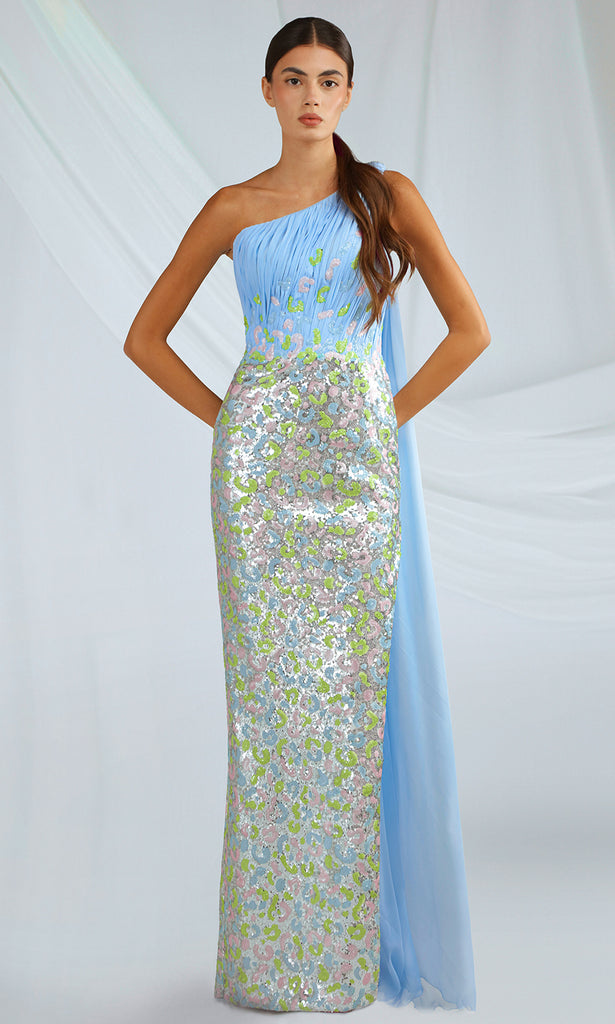 | Details: | Multicolored Sequins, One Shoulder Cape, Ruched Bodice, Mid-Open Back, Fitted |