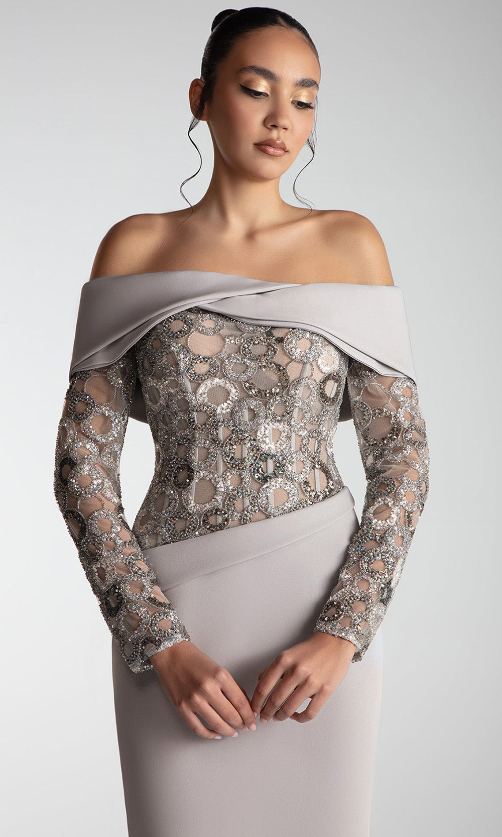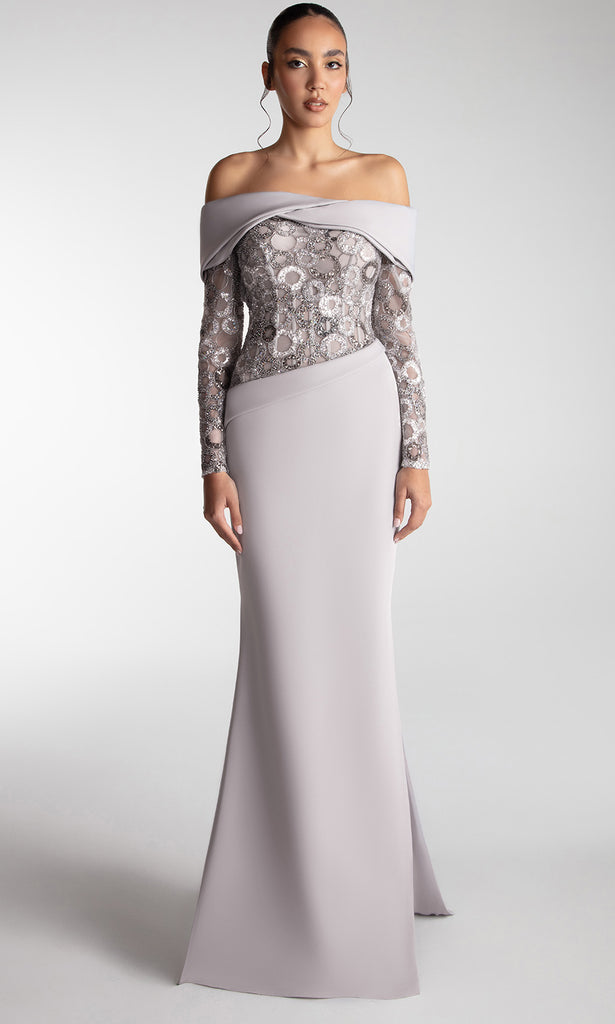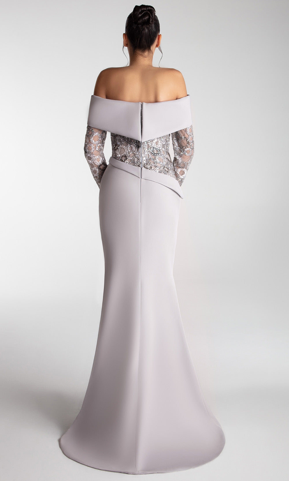 Celebrate life most treasured moments in the captivating beauty of this Gatti Nolli Couture OP-7717. Its elegant off-shoulder neckline adds soft dimension above a structured, bead-accented bodice that highlights careful craftsmanship. The fitted long sleeves add visual continuity, while the asymmetrical waistband creates graceful shaping at the waist. A smooth sheath skirt extends to the ground, producing a clean and continuous line. The Gatti Nolli Couture OP-7717 balances embellishment and simplicity in a way that conveys distinguished beauty from every angle. Model is wearing Grey Silver color.
