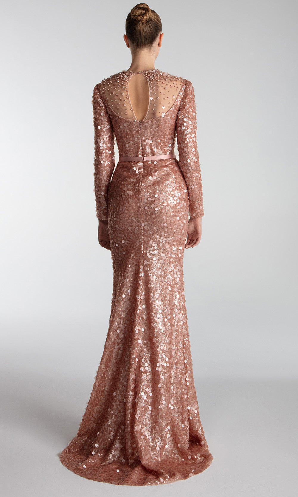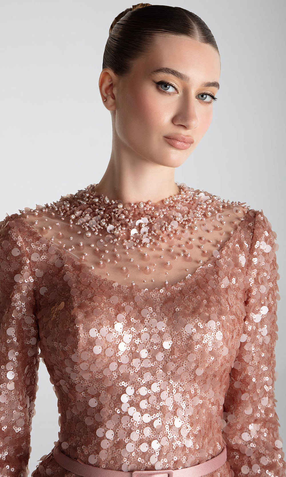 An impression of luminosity surrounds the Gatti Nolli Couture OP-7719 evening gown. Its round sequin, pearl and crystal beading embellishment produces a gentle shimmer that travels fluidly along the fitted frame. The high neckline and long sleeves provide refined balance, complemented by a thin belt that enhances proportion. The gown sheath contour flows into a trailing sweep train, capturing an aura of poised and effortless beauty. Gatti Nolli Couture OP-7719 embodies balance and thoughtful design, revealing the beauty of precision in every element. Model is wearing Blush color.