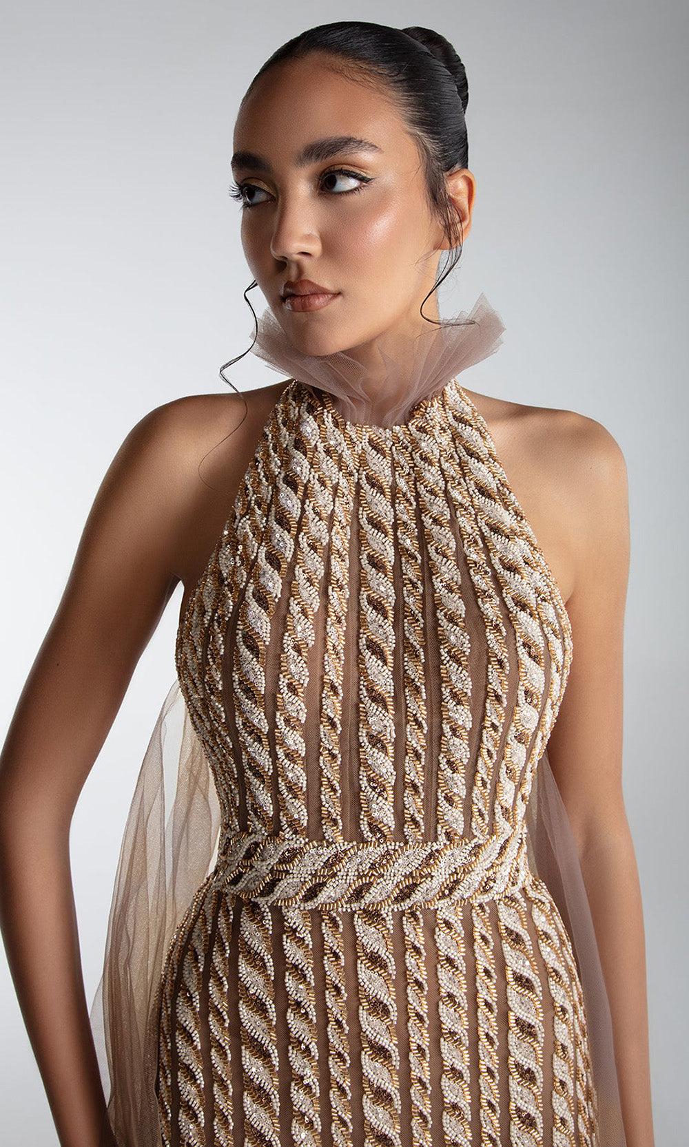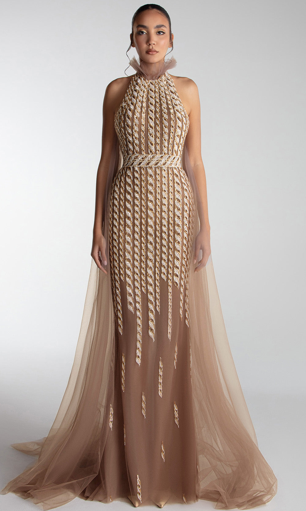 Stepping into the Gatti Nolli Couture OP-7721 creates a feeling of calm strength and polished grace. The gown follows each contour naturally, flowing with ease while the halter neckline highlights the shoulders. Crystal beaded and sequin embroidery draws the eye downward, creating an elongated visual that enhances figure. A beaded wide waistband ties the look together, complemented by a sheer layered cape that moves with subtle energy. Experience the Gatti Nolli Couture OP-7721 and bring an element of artistry to your next event. Model is wearing Copper color.