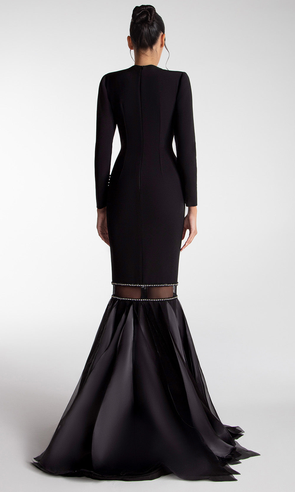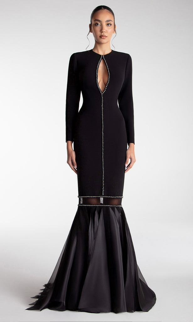 Dramatic structure meets modern femininity in this Gatti Nolli Couture OP-7729 gown that makes a statement without excess. The fitted silhouette features a central keyhole opening that draws the eye vertically, framed with Swarovski crystal accents that add a touch of intricacy. Long sleeves balance the high neckline, while the mermaid skirt highlights the dramatic laser-cut organza panels and sheer inset. For gala nights or red carpet events, Gatti Nolli Couture OP-7729 is a standout choice with elevated charm. Model is wearing Black color.
