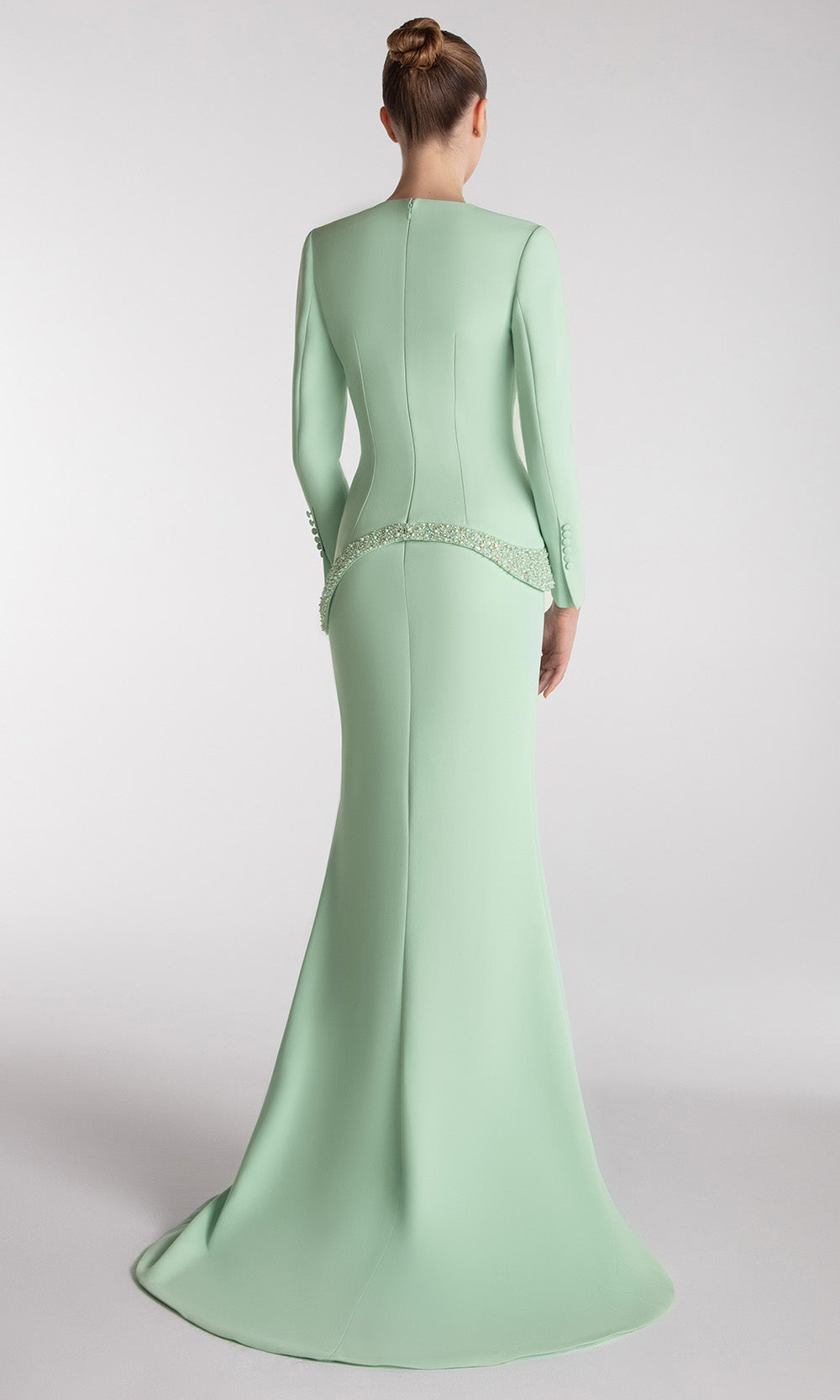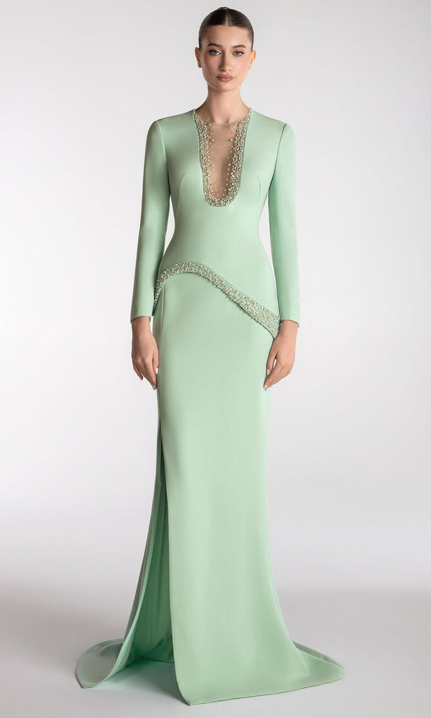 A contemporary take on understated drama defines Gatti Nolli Couture OP-7733 style. The illusion jewel neckline opens into a plunging inset framed with beaded pearls, offering coverage with impact. An asymmetrical beaded peplum draws attention to the narrowest part of the figure while subtly shaping the silhouette. The sheath skirt falls into a sweep train, paired with full-length sleeves for balanced refinement. Gatti Nolli Couture OP-7733 is perfect for formal moments that call for confidence, detail, and flawless execution. Model is wearing Mint color.