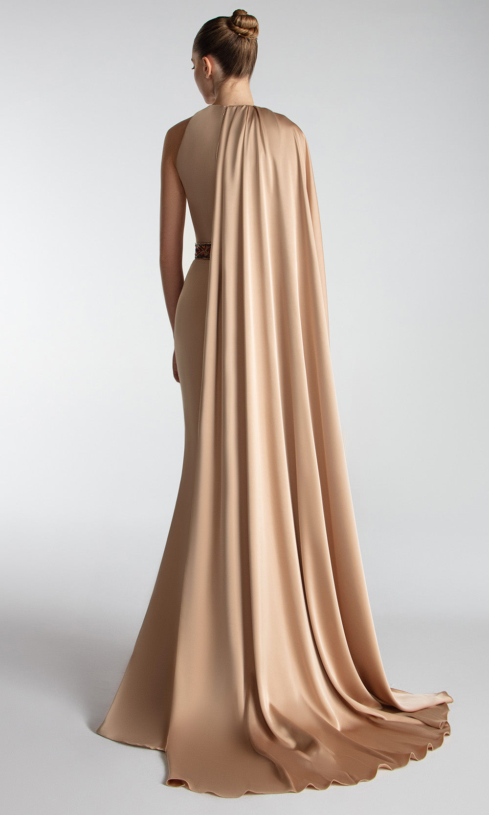 Unveil a vision of lasting beauty in this Gatti Nolli Couture OP-7735 gown that exude effortless sophistication. The structured high neckline softens into a cascading one-shoulder cape, producing a silhouette alive with movement and refinement. Pleats along the bodice flatters the frame, leading into an embroidered waistband that draws focus to the natural waist. The sheath skirt continues the sculpted theme, hugging the figure before brushing the floor with a soft, fluid finish. For evening affairs that call for memorable simplicity, Gatti Nolli Couture OP-7735 delivers dramatic elegance with subtle confidence. Model is wearing Gold color.