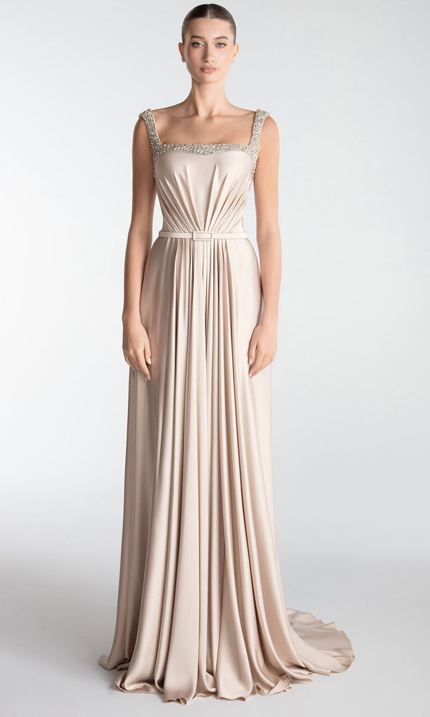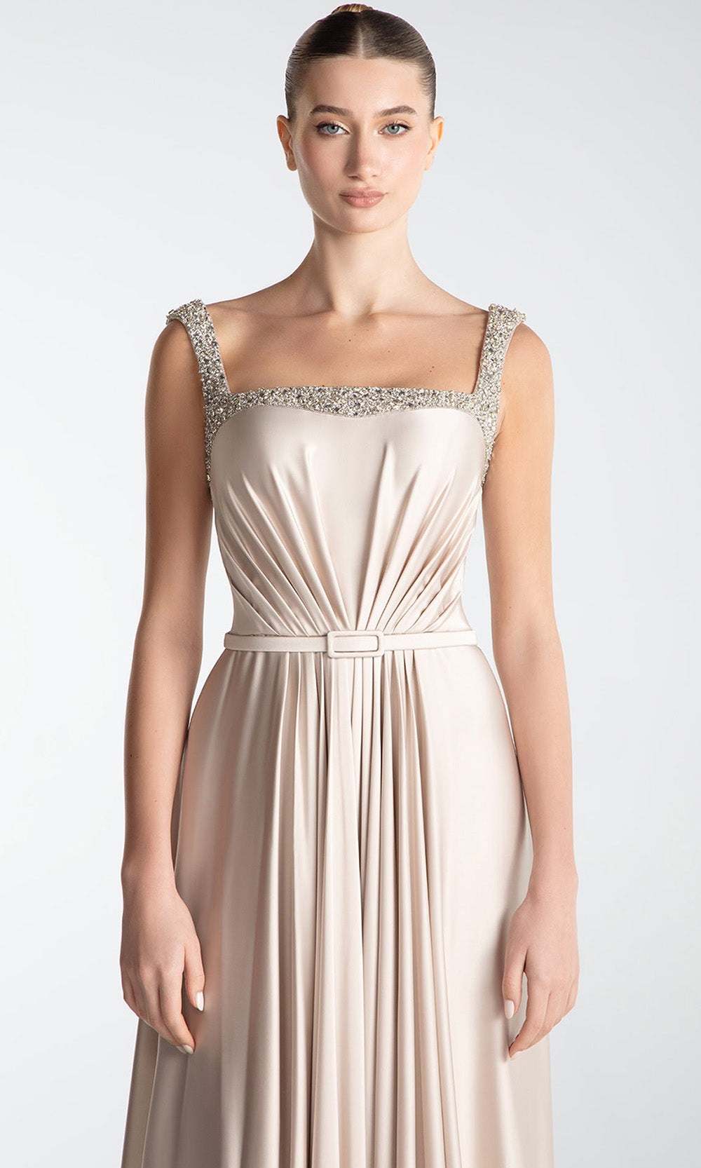 In Gatti Nolli Couture OP-7736 style, feel the ease of elegance with every graceful stride. A square neckline draws attention to her posture, framed by wide embellished straps that catch the light in subtle glints. The bodice is softly ruched and pleated, highlighting the natural waist with a delicate satin belt that defines the form. The A-line skirt flows from the waistline in a cascade of pleats, creating soft volume and a balanced silhouette. Gatti Nolli Couture OP-7736 invites a sense of poise and grace to special evenings that deserve timeless elegance. Model is wearing Beige color.
