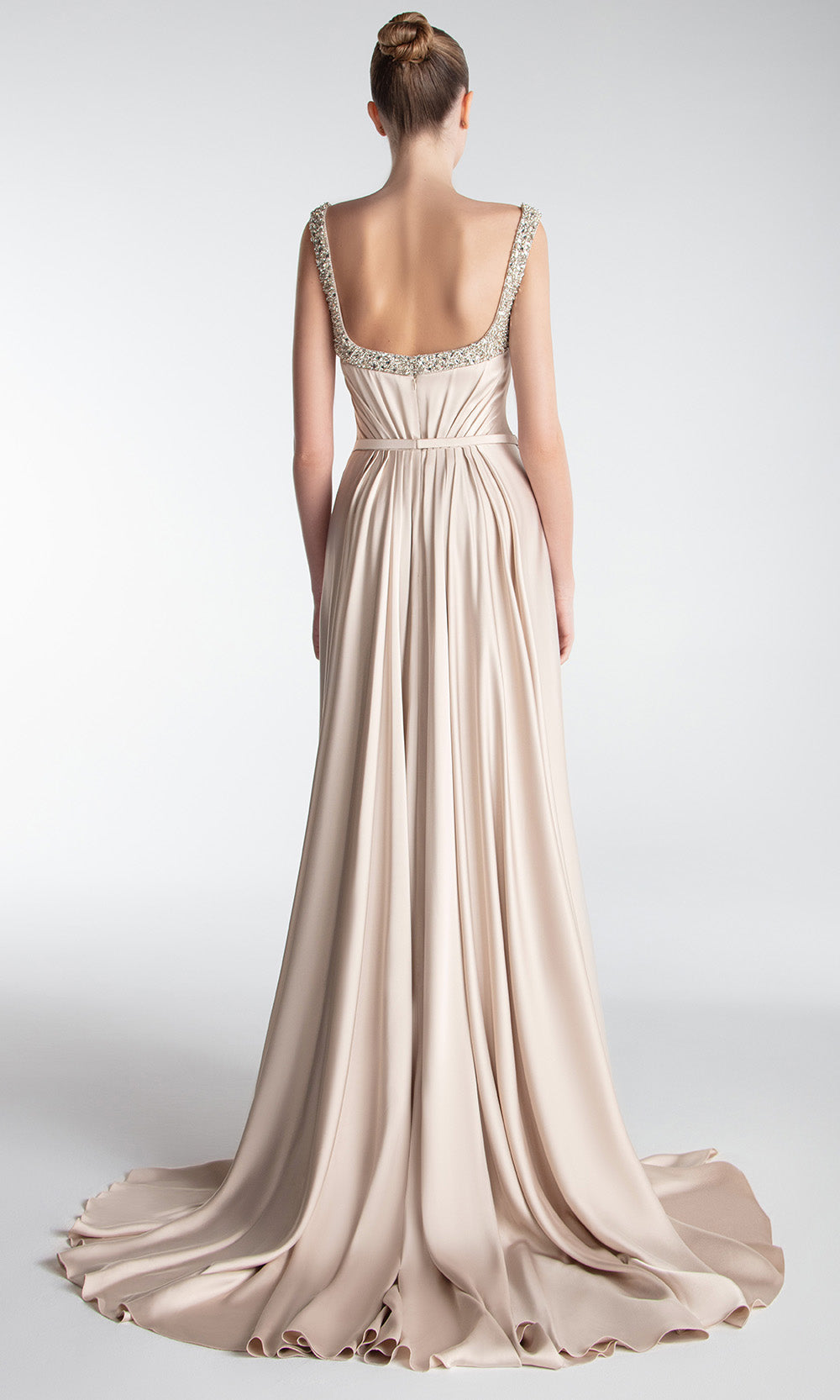 | Details: | Wide Embellished Straps, Belted Waist, Embroidered Swarovski Crystals, Pleated Skirt, Open Back |