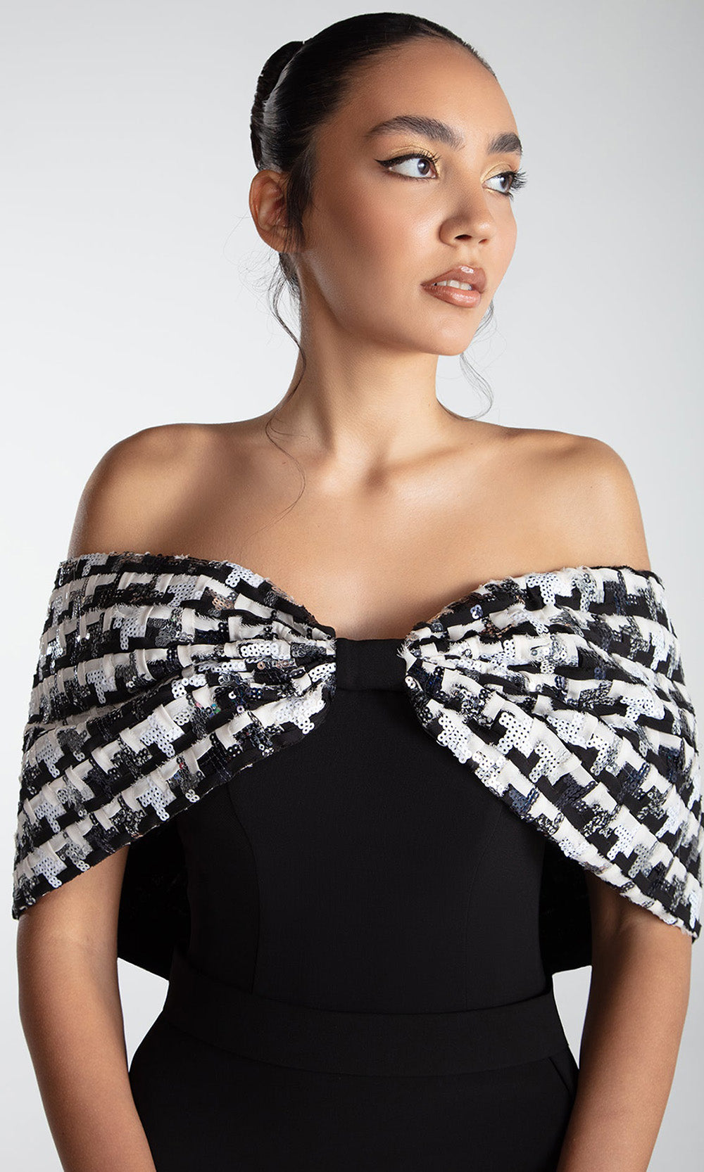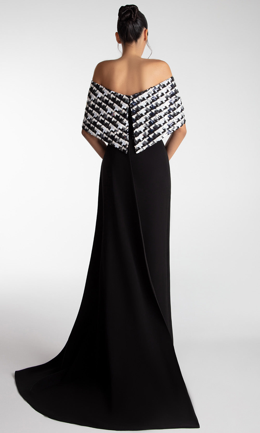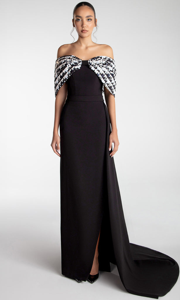 Make a lasting impression in Gatti Nolli Couture OP-7738, wrapped in design that speaks without words. The off-shoulder sweetheart neckline is framed by a distinctive embroidered cape shaped like a bow, adding dynamic structure to the upper silhouette. A fitted bodice flows seamlessly into a tailored column skirt, punctuated by a side slit that allows freedom with every step. The train trails behind softly, providing balance to the modern, structured poised. Gatti Nolli Couture OP-7738 commands attention through its striking design and elevated sense of sophistication. Model is wearing Black & White color.