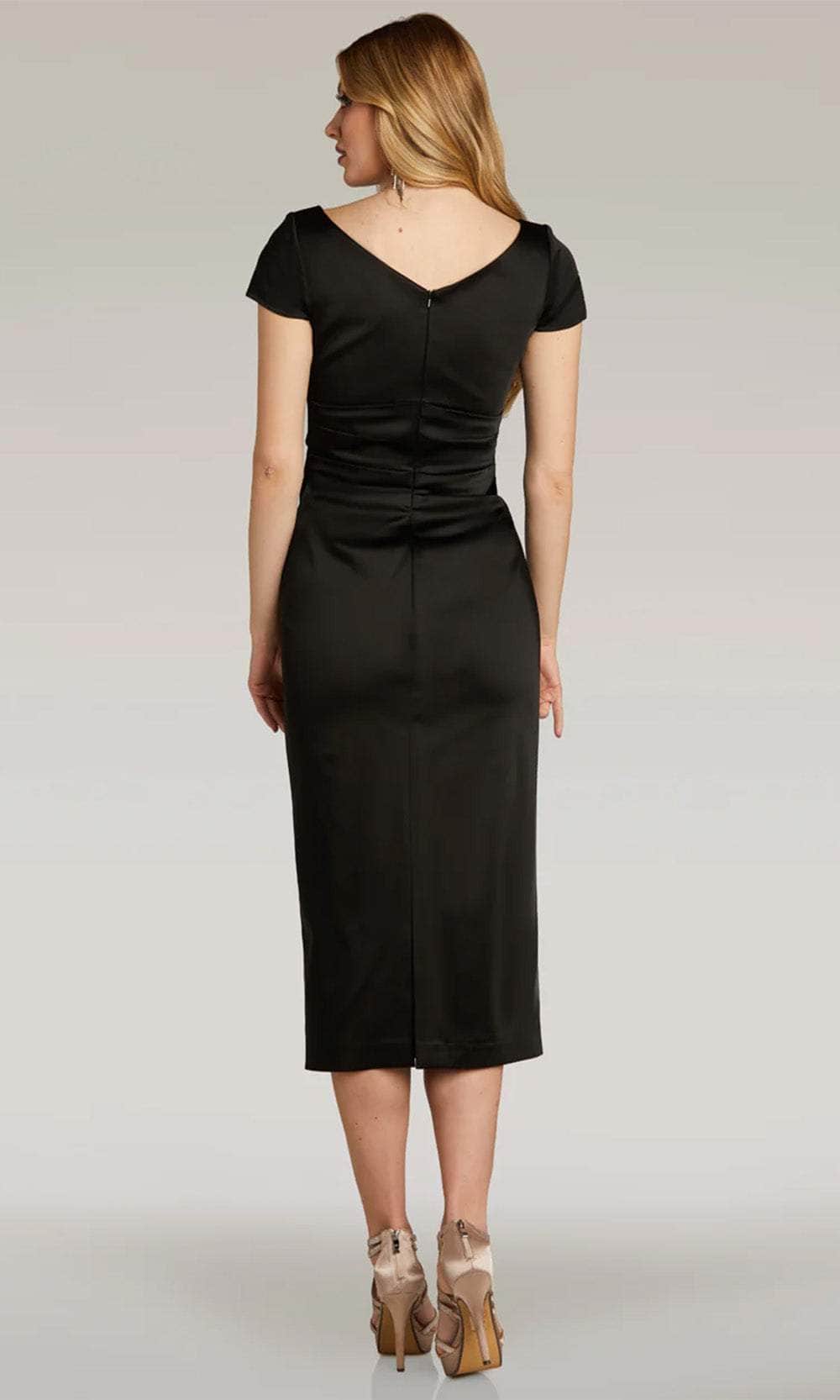 Grace the stunning gala with confidence and elegance in the Gia Franco 12282 creation. Meticulous tailoring lines gracefully trace the enchanting curves of this ensemble. The asymmetrical v-neckline delicately highlights a ruche-detailed bodice, exuding sophistication. Featuring a short-sleeved design, a tailored fit is ensured by the v-open back and a concealed zipper closure. The sheath skirt descends with grace, boasting a back slit for ease of movement and a tea-length hem. With its seamless fusion of refinement and allure, the Gia Franco 12282 masterpiece epitomizes timeless sophistication. Model is wearing the Black color.