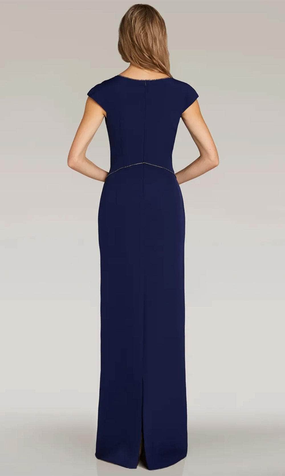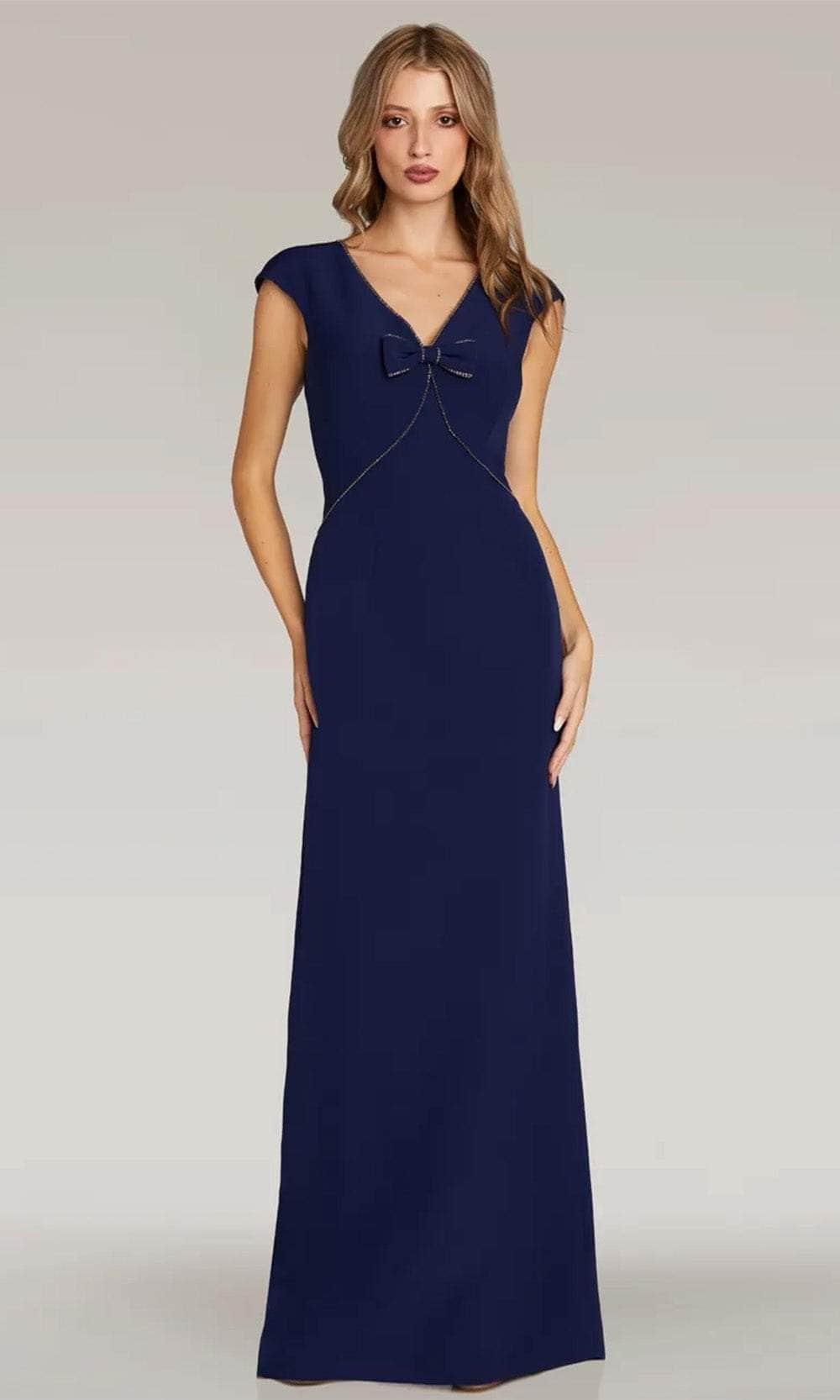 Indulge in the refined elegance embodied by the Gia Franco 12307 creation, a polished emblem of sophistication and femininity. Meticulously crafted tailoring lines delicately trace the enchanting curves of this ensemble. The V-neckline gracefully highlights a bow-detailed bodice adorned with metallic embellished trim. Enhancing its allure with a cap sleeve design, a personalized fit is ensured by the full back and a concealed zipper closure. The sheath skirt descends with poise, featuring a back slit for ease of movement and a floor-length hem. With its seamless fusion of refinement and glamour, the Gia Franco 12307 masterpiece exudes timeless sophistication. Model is wearing the Navy color.