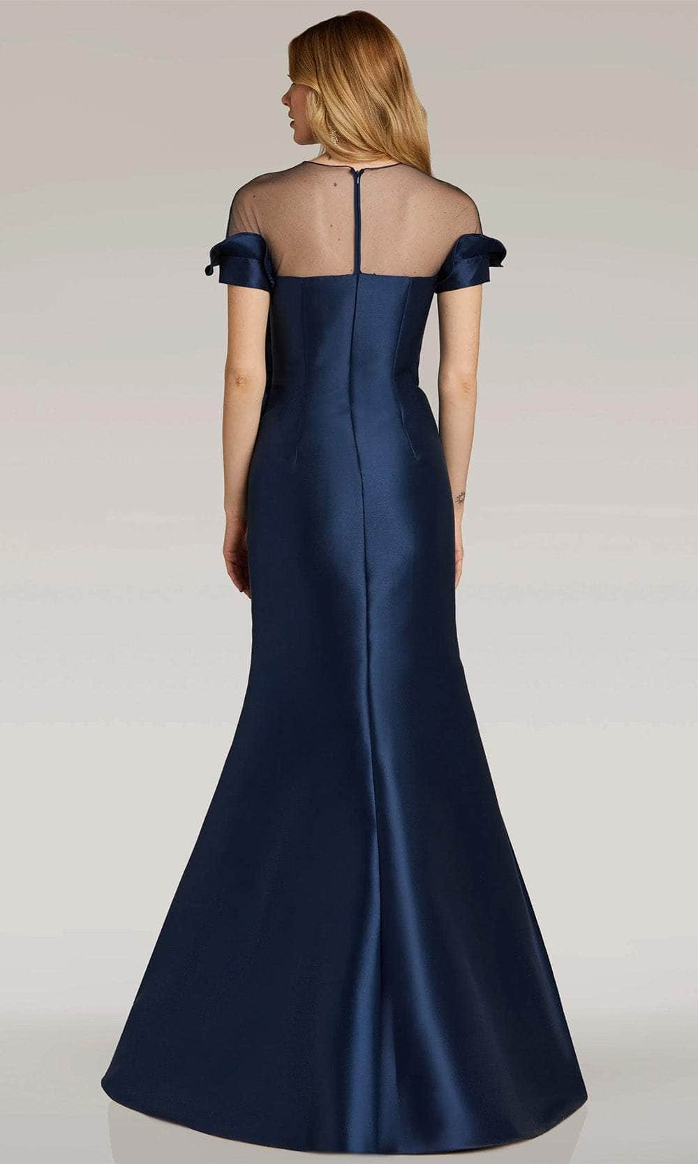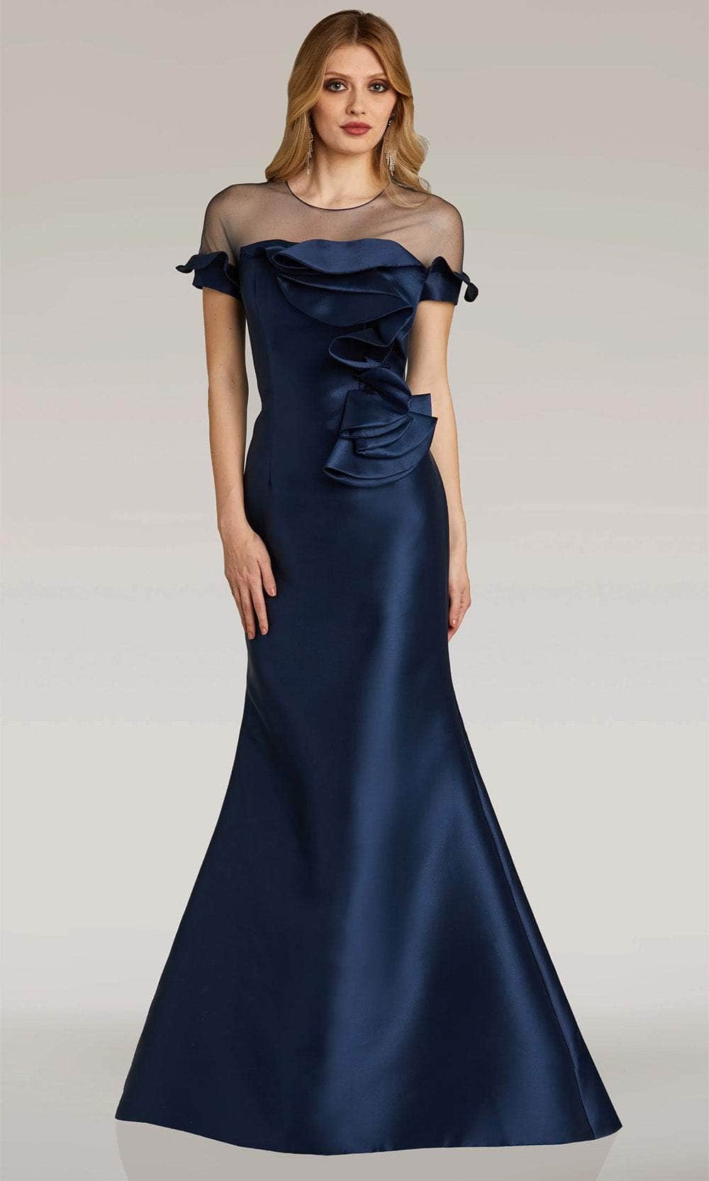 Charm everyone with the fantastic flair of this Gia Franco 12315 creation. Meticulously crafted tailoring lines delicately trace the enchanting contours of this ensemble. Fashioned from luxurious Mikado fabric and enhanced with a graceful illusion jewel neckline with short sleeves, this gown features a foldover detail and a ruffle trim accent flowing down the sculpted bodice. A customized fit is ensured by the sheer full back and a concealed zipper closure. The trumpet skirt descends gracefully and concludes in a sweeping train. Radiating with timeless elegance, the Gia Franco 12315 masterpiece exudes captivating sophistication. Models are wearing the Navy and Silver colors.