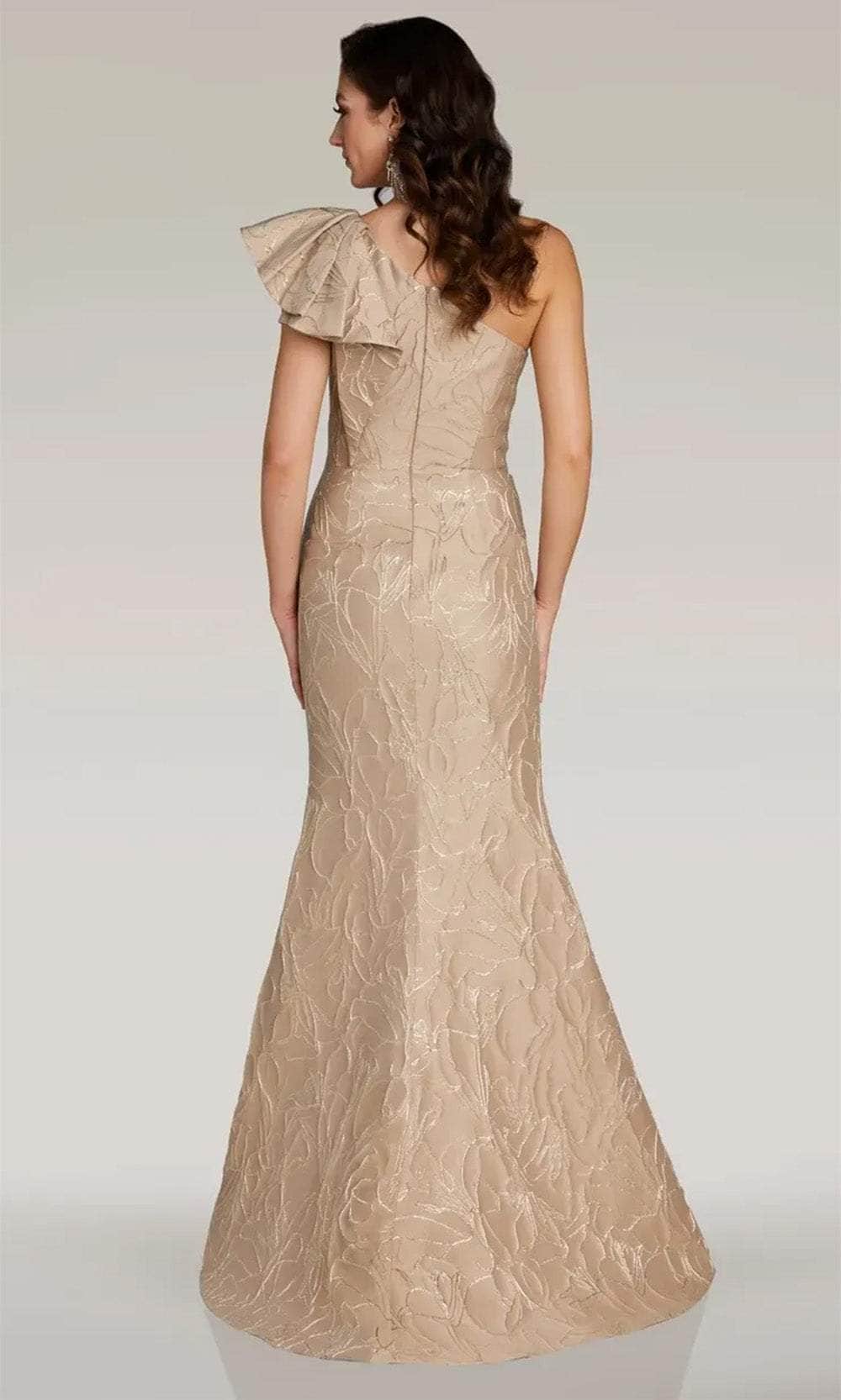 Showcase flawless grace and beauty in the Gia Franco 12375 creation. Elaborately crafted seams intricately outline its captivating embossed detailed silhouette. The gown showcases a one-shoulder neckline, highlighting a flawlessly sculpted bodice complemented by a stunning flutter sleeve. Adorned with a ruffle accent, this gown features a partially open back and a concealed zipper closure, ensuring a tailored and flattering fit. The trumpet skirt flows elegantly into a sweeping train. Make a confident entrance onto the red carpet in the Gia Franco 12375 masterpiece, a timeless creation exuding sophistication. Model is wearing the Champagne color.