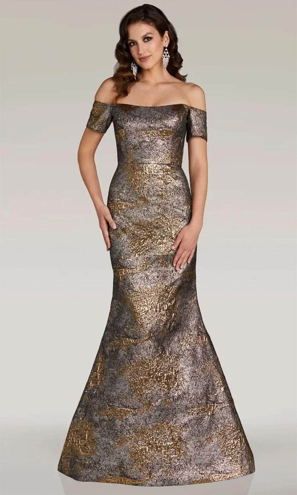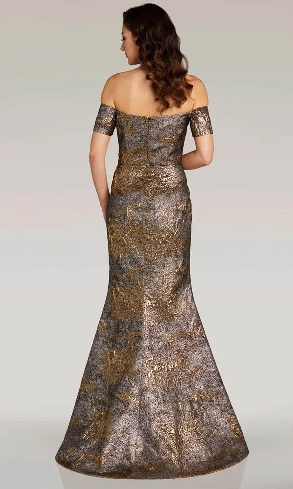 Exude timeless grace and remarkable sophistication while wearing this Gia Franco 12376 creation. Elaborately crafted seams intricately define its captivating metallic detailed silhouette. The gown showcases an off-shoulder neckline, accentuating a flawlessly sculpted bodice embellished with embossed details. Decorated with short sleeves, this gown boasts a midrise back and a concealed zipper closure, ensuring a tailored and flattering fit. The trumpet skirt flows elegantly into a sweeping train. Walk confidently onto the red carpet in the Gia Franco 12376 masterpiece, a timeless work of art radiating sophistication. Models are wearing the Charcoal and Gold colors.