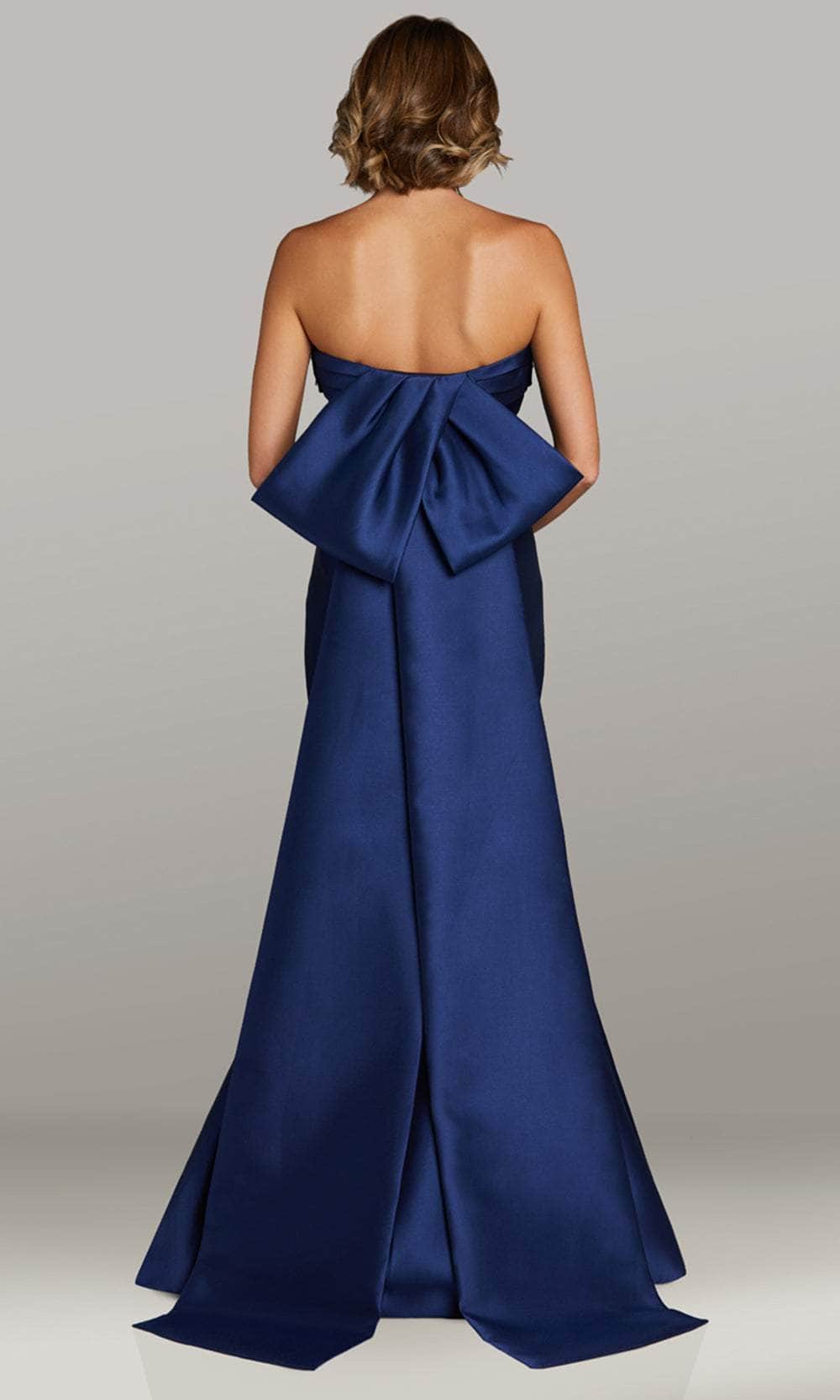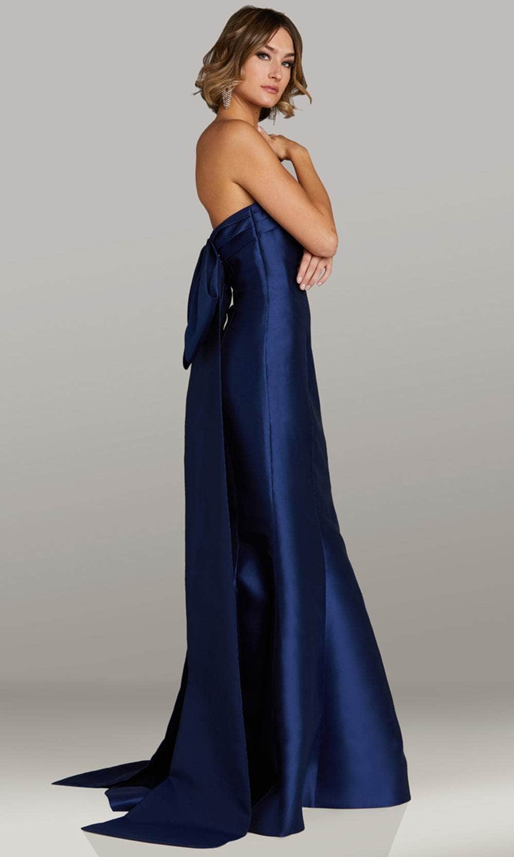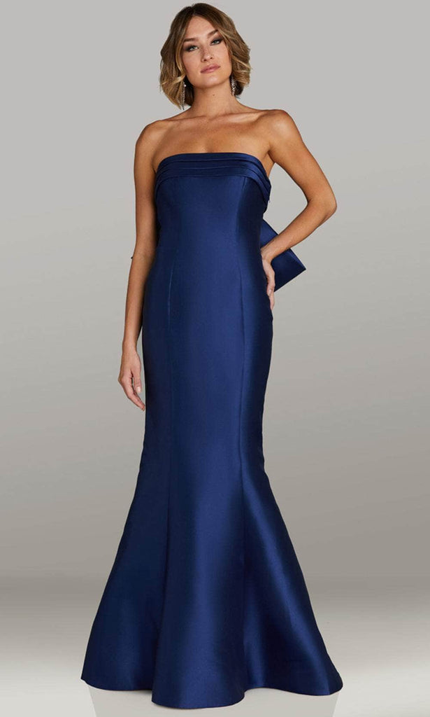 Make your evening truly enchanted by wearing the Gia Franco 12411 masterpiece. Designed with a strapless silhouette, this gown presents a captivating pleated trim on the straight-across neckline. The seam-sculpted bodice creates a structured yet feminine appearance. A glimpse of your skin is showcased through the midrise back, and it has a dramatic bow accent with a trailing tail that makes it a true showstopper. The skirt widens elegantly from the knees and contours closely to the hips, carving a mesmerizing mermaid silhouette. Leave a lasting impression in this queenly gown from the Gia Franco 12411. Model is wearing Navy color.
