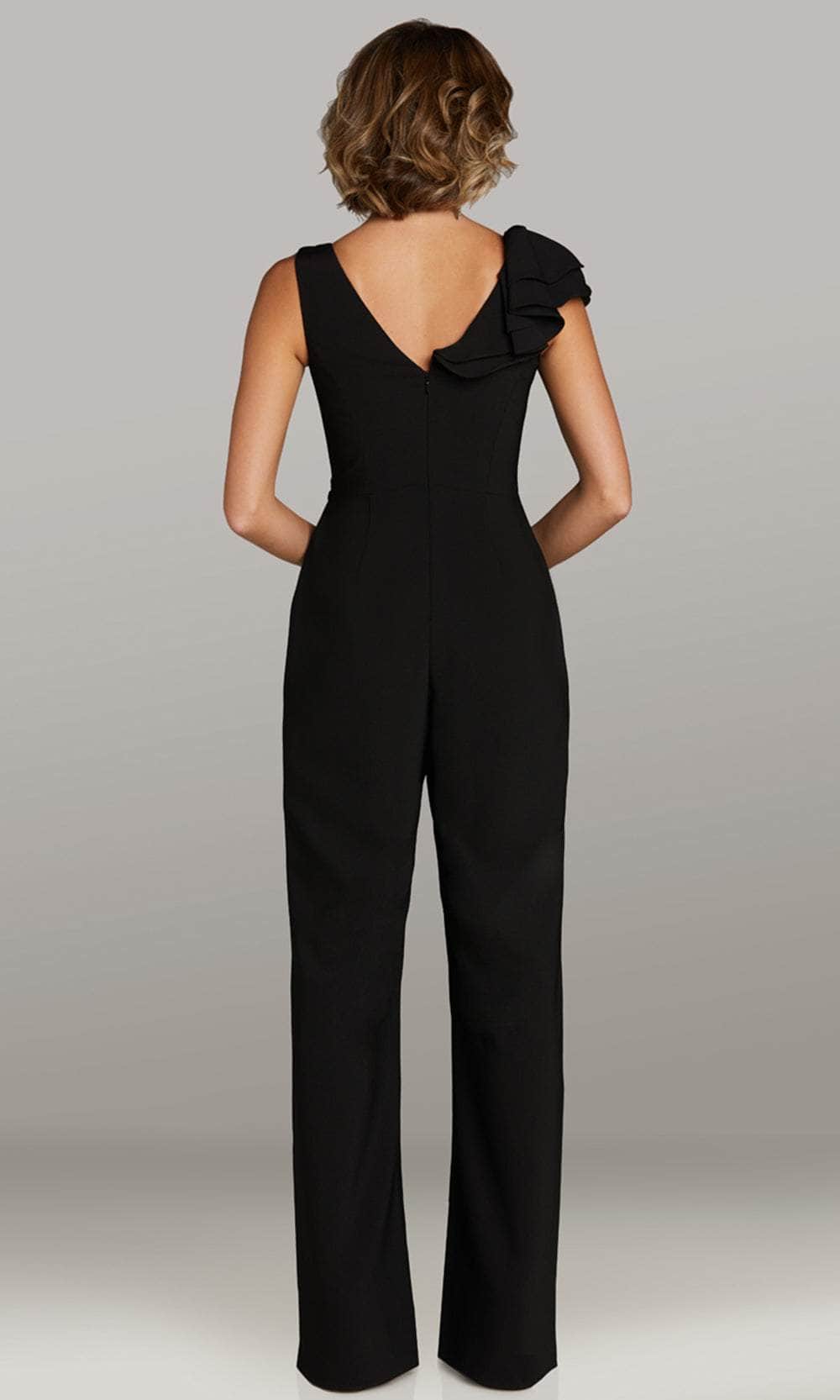 Embrace the captivating style of this creation from Gia Franco 12432. Made from high-quality scuba crepe fabric, this jumpsuit silhouette is both elegant and comfortable. The beaded appliques on the waist and the single cap sleeve with ruffled accents enhance its feminine and stylish appeal. In addition, it exhibits a v-neckline mirrored by the sultry v-back, while the single wide strap offers extra support. It ends in a pair of straight-leg pants that provide a relaxed fit. This Gia Franco 12432 jumpsuit is an essential addition to your wardrobe. Model is wearing Black color.