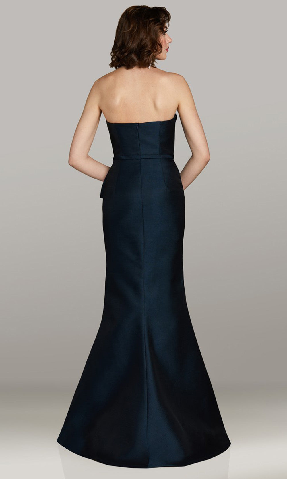 | Details: | Sculpted Pleated Bodice, Strapless, Asymmetrical Peplum Accent, Midrise Back, Floor Length Hem |