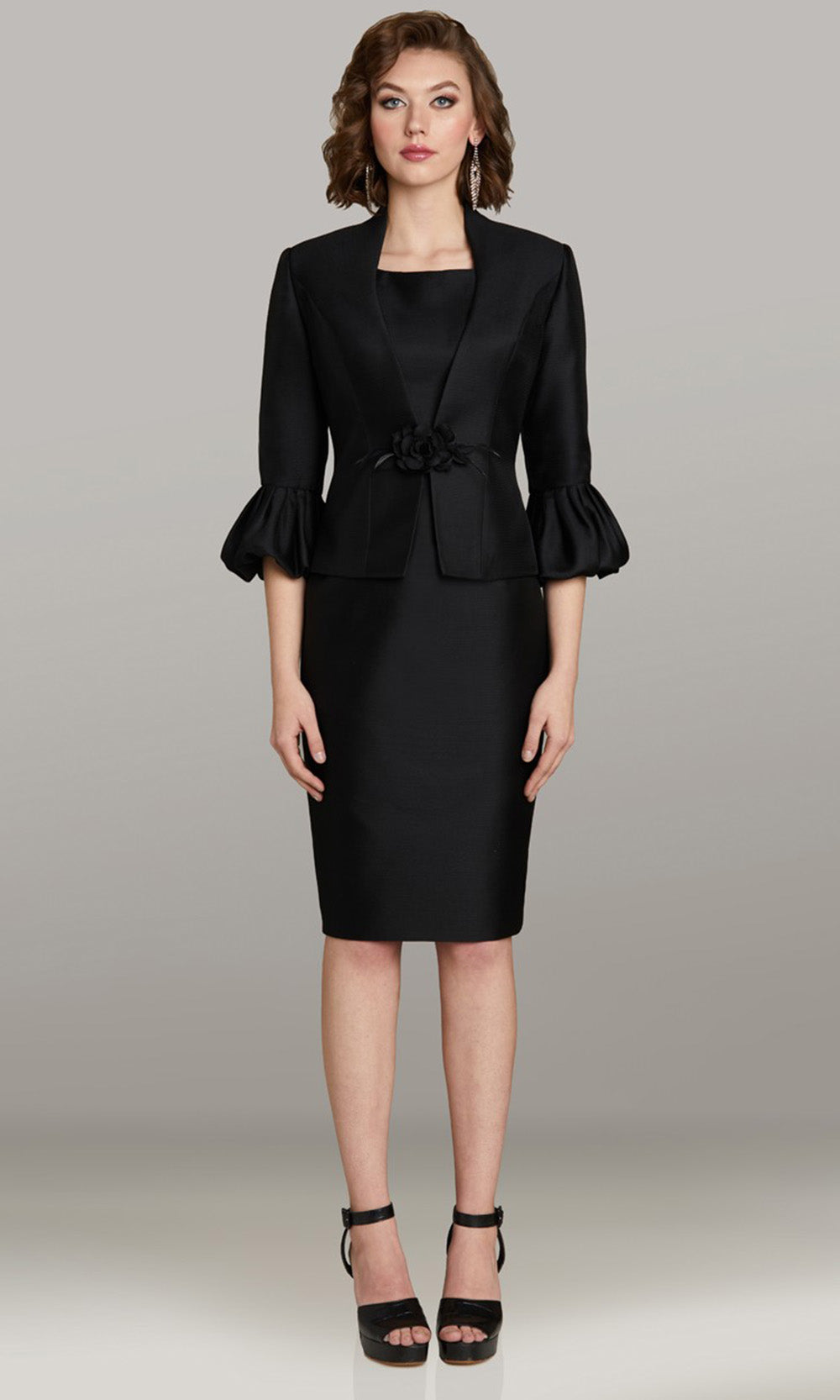The Gia Franco 12460 showcases an ensemble that exudes timeless grace through its meticulously tailored two piece design. The sleeveless column dress creates a smooth, contoured fit that enhances natural shape, while the coordinating three-quarter sleeve bolero adds refined volume with softly ruffled cuffs and a floral waist accent. Together, these elements offer balance, structure, and sophistication. Whether worn for a daytime reception or an evening affair, the Gia Franco 12460 knee-length dress brings enduring elegance and a polished finish to any refined celebration. Model is wearing Black color.