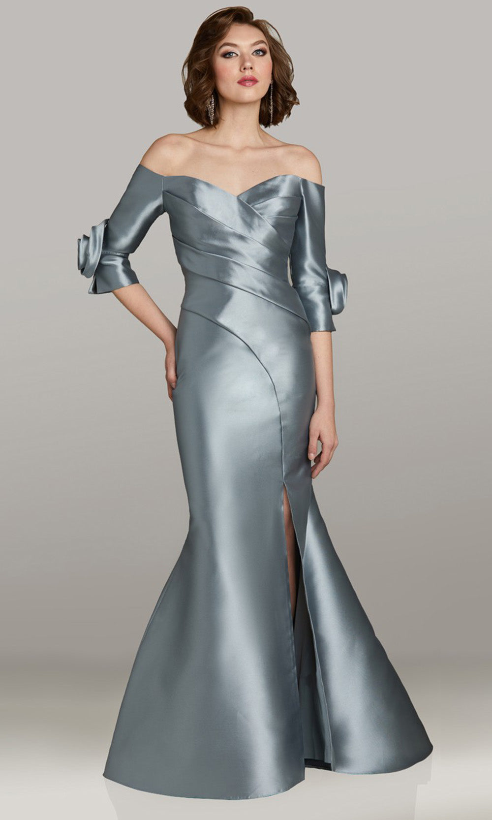 | Details: | Three-Quarter Sleeves, 3D Rosette Accent, Pleated Bodice, Front Slit, Back Zipper Closure, Floor-Length Hem |
