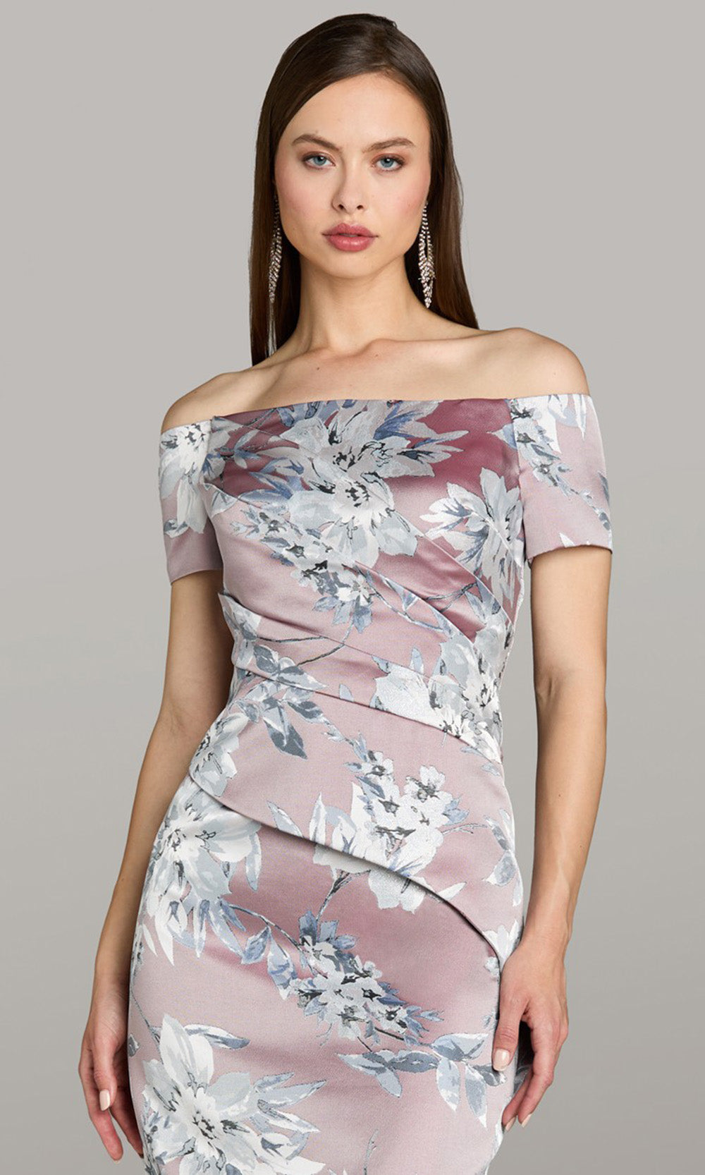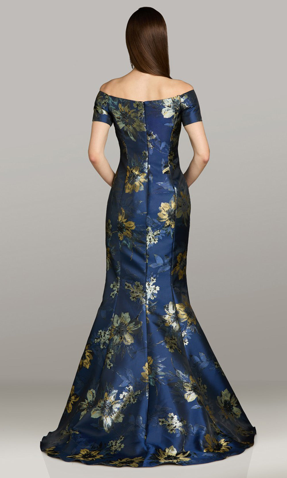 The timeless allure of evening elegance is beautifully reflected in the Gia Franco 12573. This design celebrates refined sophistication with a sculpted fit that accentuates natural curves and exudes polished confidence. The off-shoulder neckline and short sleeves gracefully enhances the collarbone, while the wrapped bodice and contoured seams create depth and structure. Finished with a sweeping mermaid hem and all-over floral pattern, the Gia Franco 12573 delivers an unforgettable impression for upscale gatherings that call for graceful poise and modern charm. Models are wearing Navy, and Blush colors.