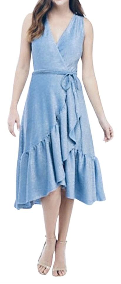 Details: Knitted Lurex (95% Polyester, 5% Spandex) Lining (100% Polyester), Sleeveless, Surplice / faux wrap bodice, Ruffed hem, Detachable Waist Tie, Exposed Back Zipper