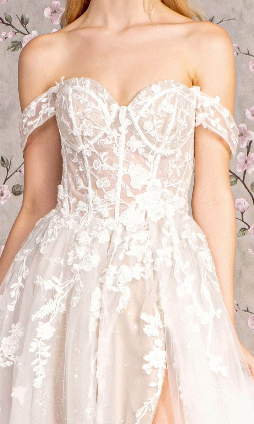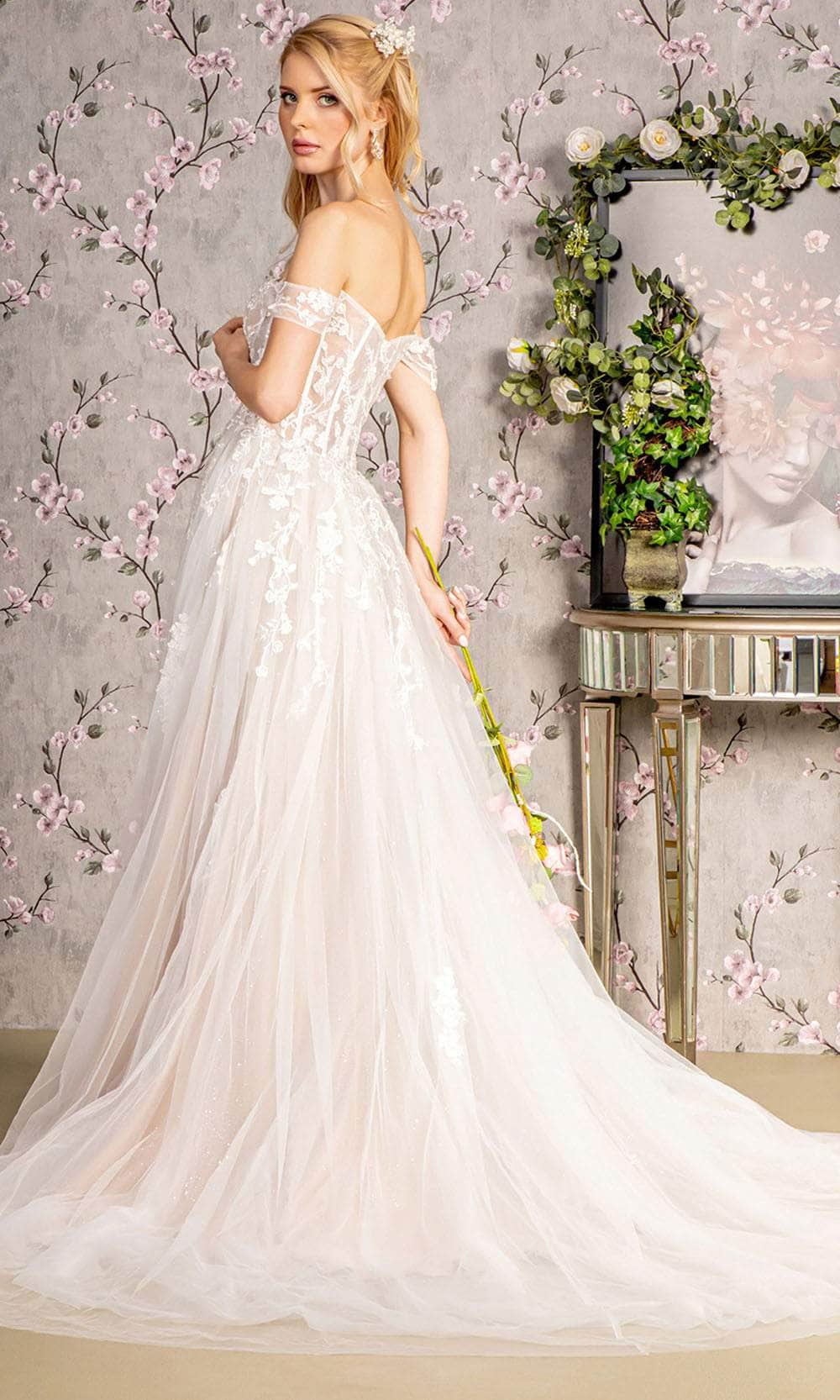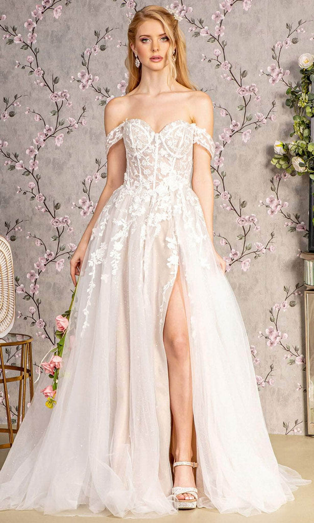 Embrace glamour and sophistication on your momentous day with the GLS by Gloria Bridal GL3429 bridal gown. Featuring an enchanting off-shoulder neckline and a fitted corset bodice, this dress exudes elegance. The mid-open back is gracefully secured by a zipper for a polished touch. A high slit graces the floor-length A-line skirt, adding a captivating allure, while a fabulous court train enhances the overall refinement of this creation. With a captivating blend of embroidery, glitters, and sequins, this gown ensures you stand out with eye-catching allure. Stride with confidence in this chic and refined GLS by Gloria Bridal GL3429 masterpiece. Model is wearing Ivory/Champagne color.