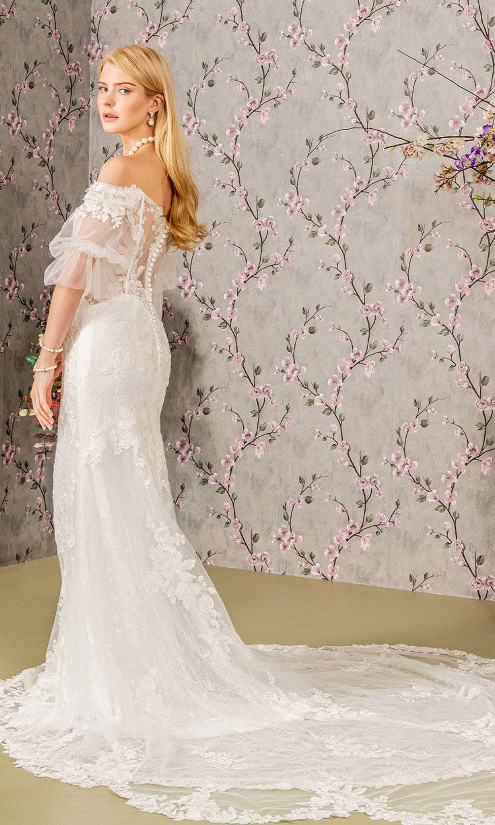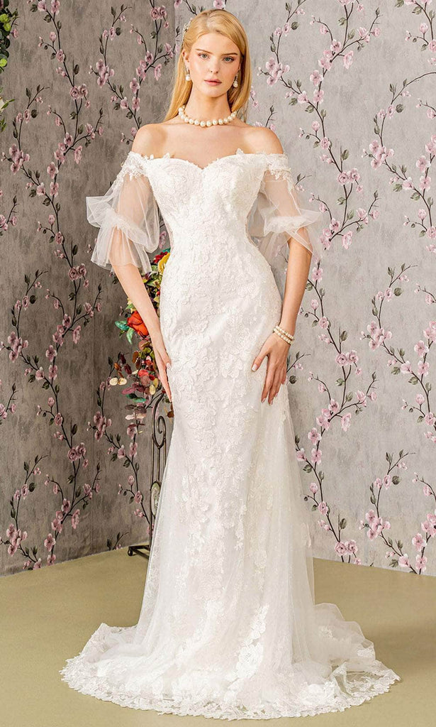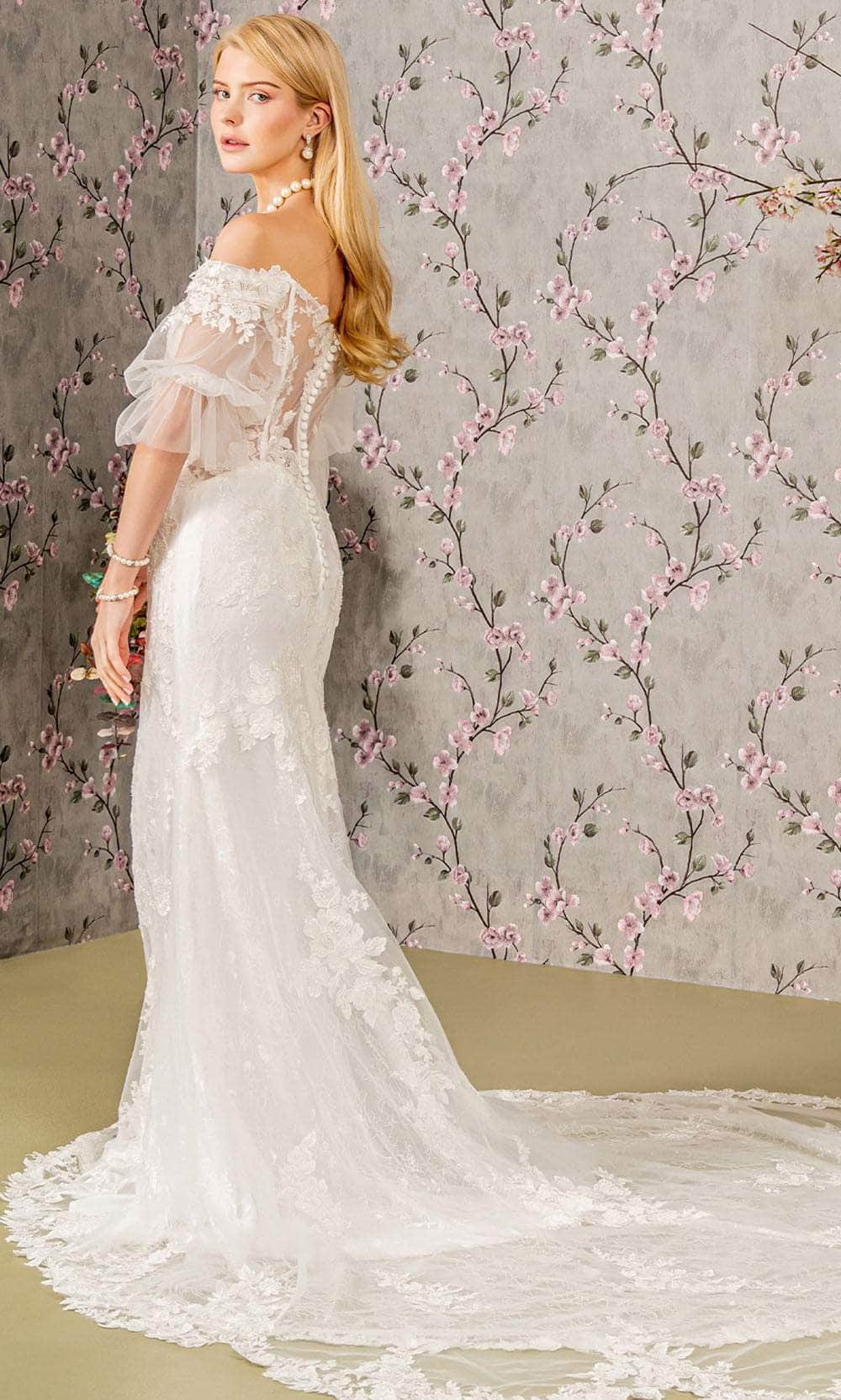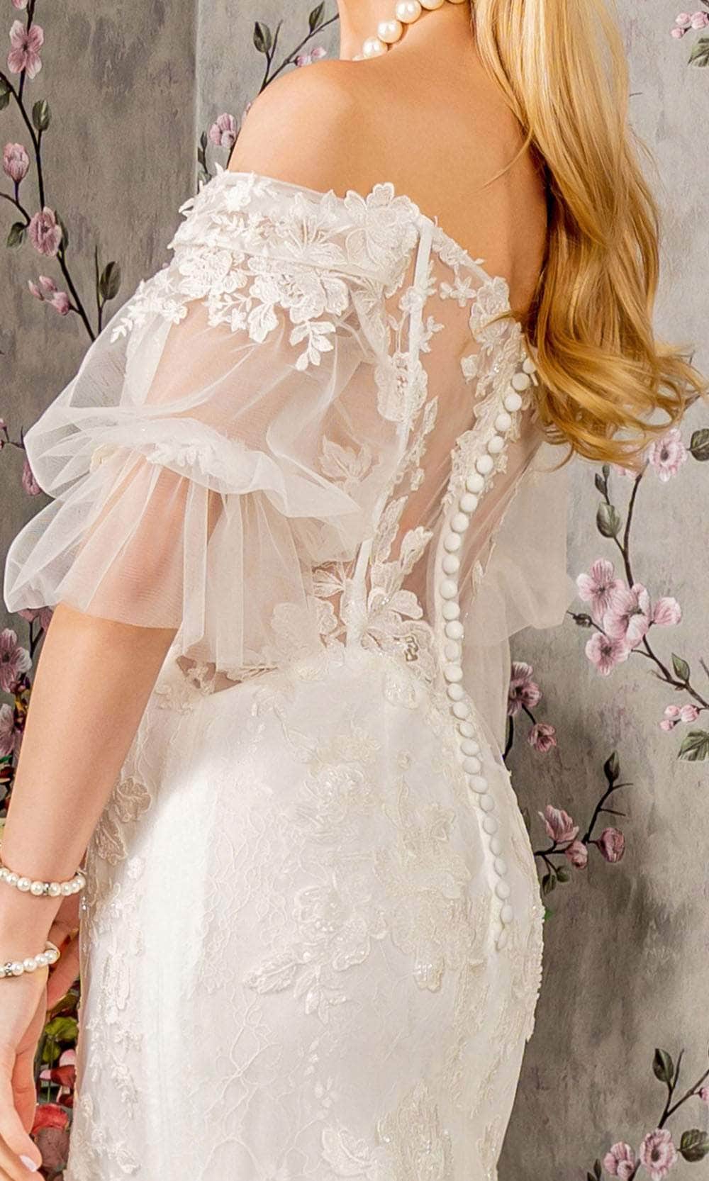 Elevate your bridal look with GLS by Gloria GL3479, a romantic gown featuring an off-shoulder bodice framed with flutter short sleeves and crowned with a sweetheart neckline. The exquisite ensemble is detailed with delicate buttons, adding a touch of timeless charm. The floor-length mermaid silhouette gracefully parades, culminating in a stunning train finish. GLS by Gloria GL3479 effortlessly combines modern romance with timeless sophistication, making it a radiant choice for brides seeking elegance and allure on their wedding day. Model is wearing Ivory color.