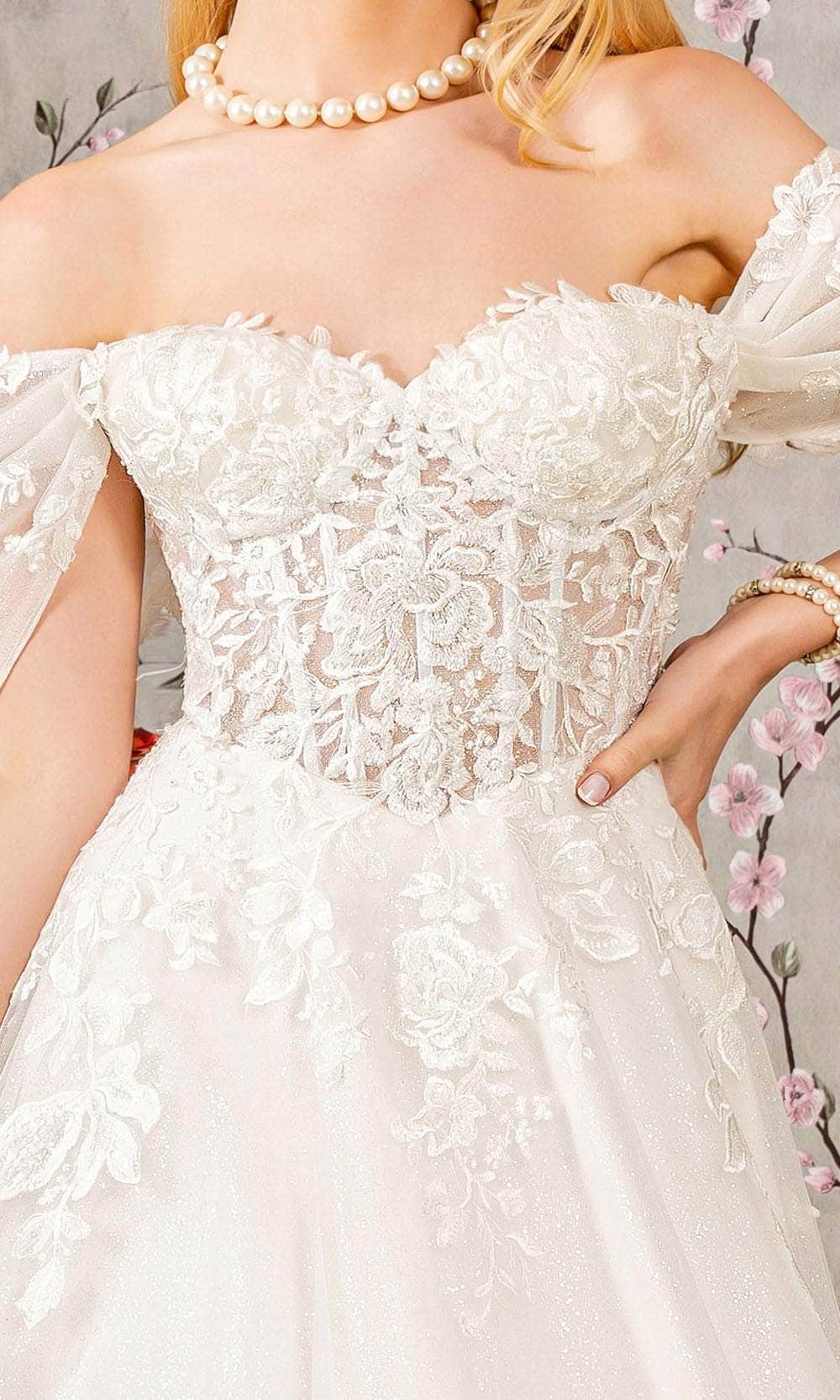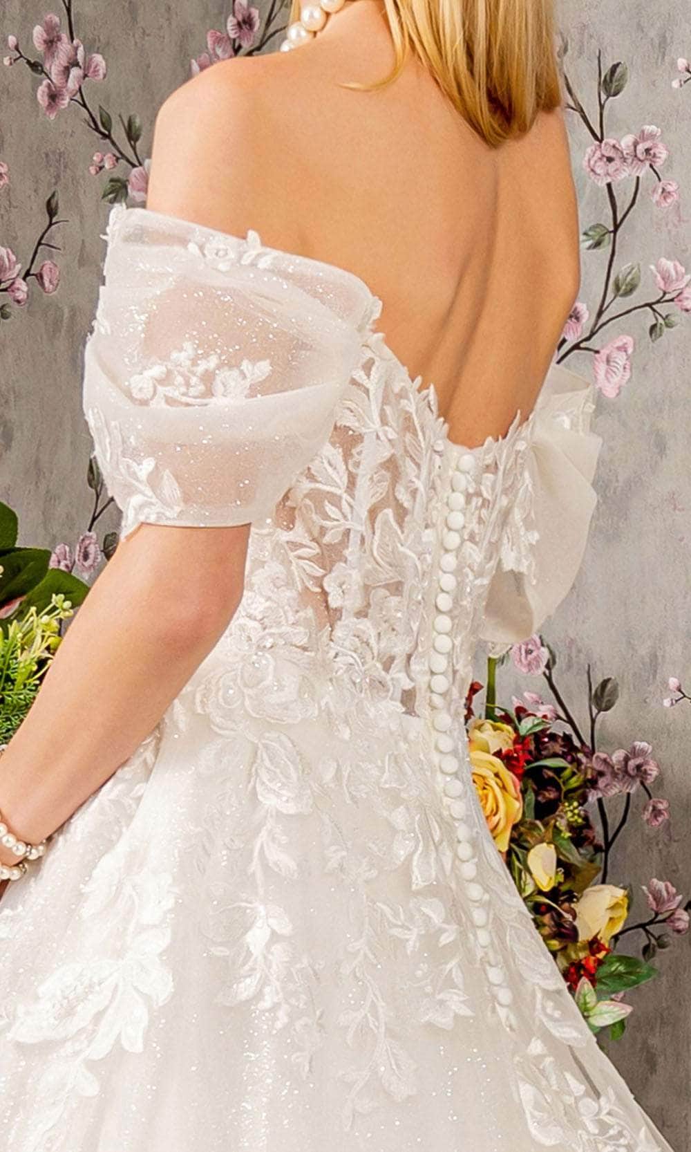 This evening gown from GLS by Gloria GL3480 will make you a mesmerizing beauty. A captivating gown beautifully embellished with intricate floral embroideries. The off-shoulder corset bodice, featuring short sleeves and a sweetheart neckline, exudes romance. Delicate buttons add a touch of timeless charm to the ensemble. The floor-length A-line silhouette gracefully parades, culminating in a stunning train finish. GLS by Gloria GL3480 seamlessly combines modern elegance with timeless sophistication, offering brides a radiant choice for their special day, where romance meets classic allure. Model is wearing White color.
