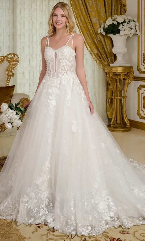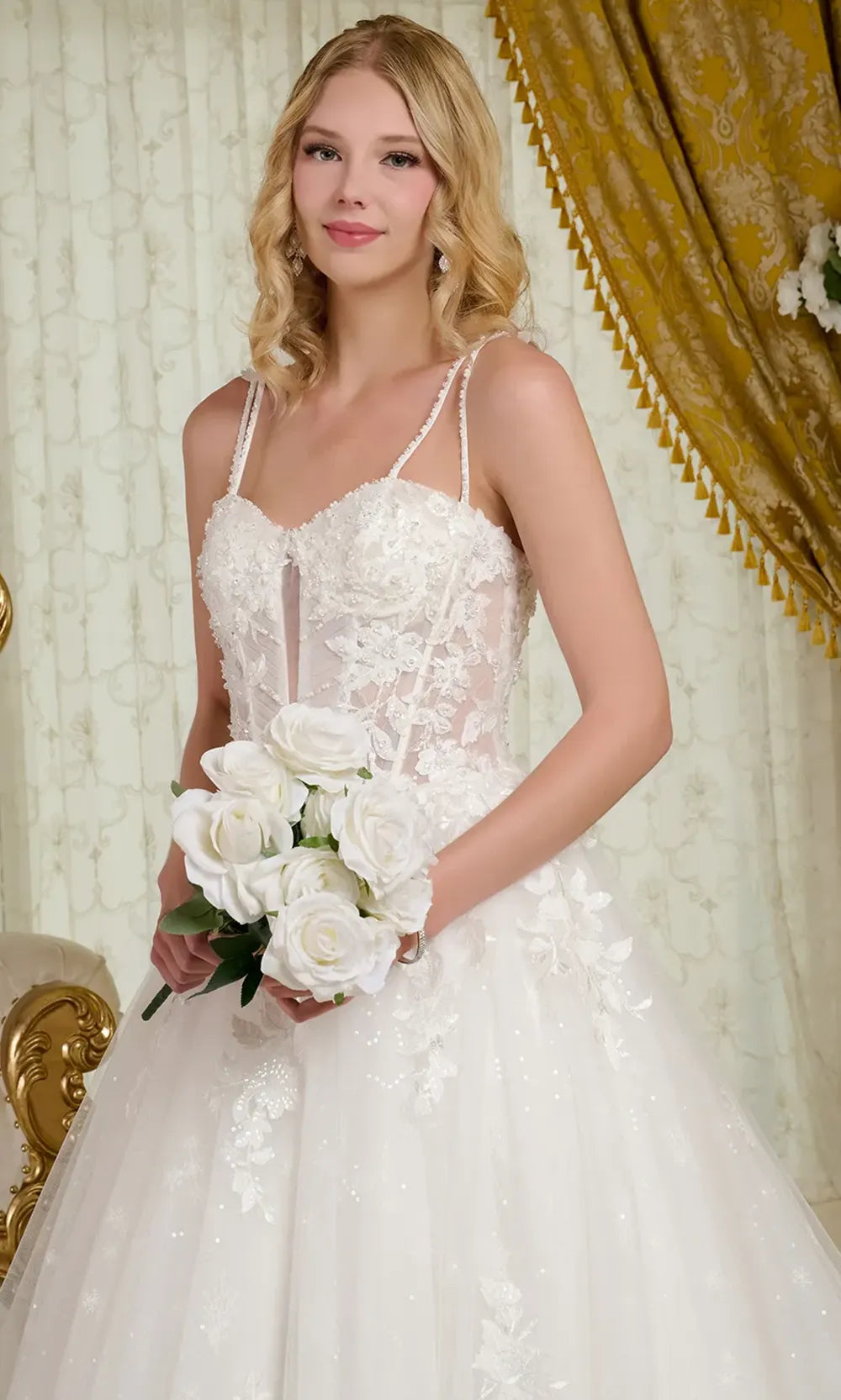 Sparkling elegance meets structured grace in a GLS by Gloria Bridal GL3660 design crafted for timeless moments. Two beaded spaghetti straps lead into a flattering sweetheart neckline that highlights the decolletage with delicate detail. The bodice radiates with intricate embroidery, sequins, and beading layered on soft tulle, while the underlayer sequin embroidery adds gentle depth and luminescence. A corseted back brings tailored form to the silhouette, and the full A-line skirt flows into a scalloped hem. Conclude with a sweeping train that glides with stunning movement. Choose GLS by Gloria Bridal GL3660 for refined bridal beauty. Model is wearing Off.Wht color.