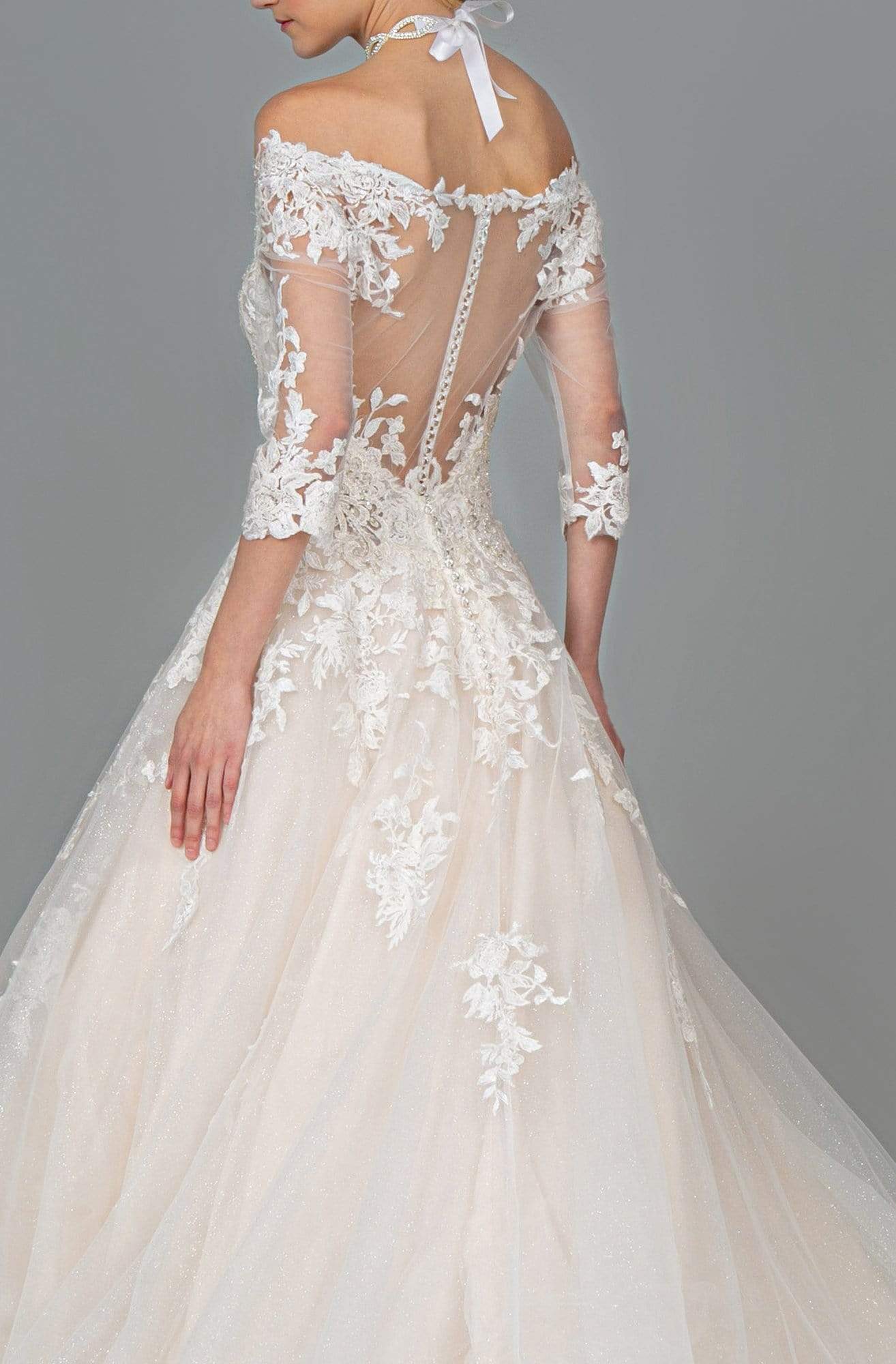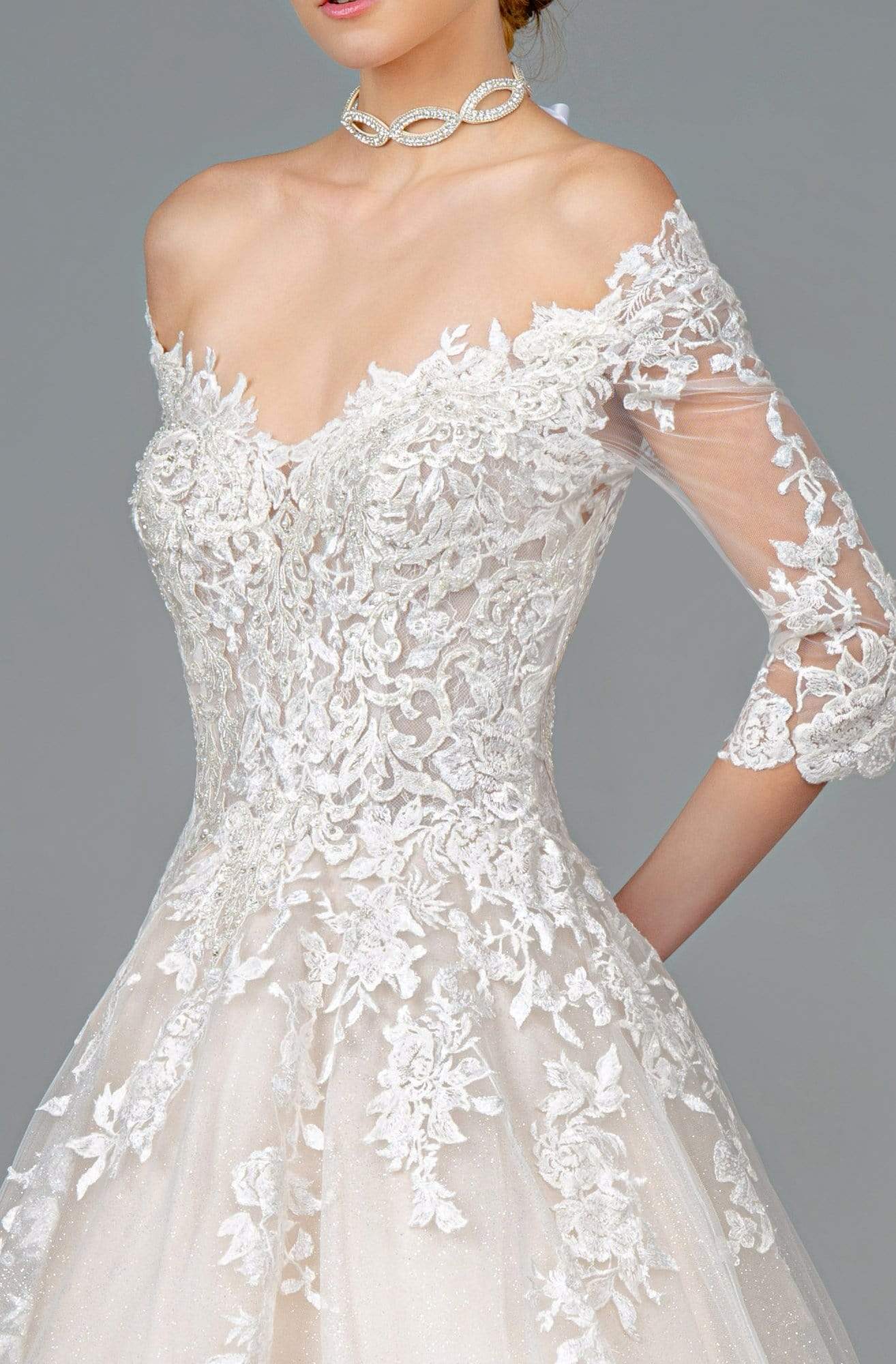 Be the spectacular belle in GLS by Gloria GL1803. This embroidered gown fashions an off the shoulder neckline with quarter length sleeves. The fitted bodice has a sheer back and back buttons. The skirt opens in a full length A-line silhouette with a train finish. This GLS by Gloria design exudes timeless, effortless elegance.